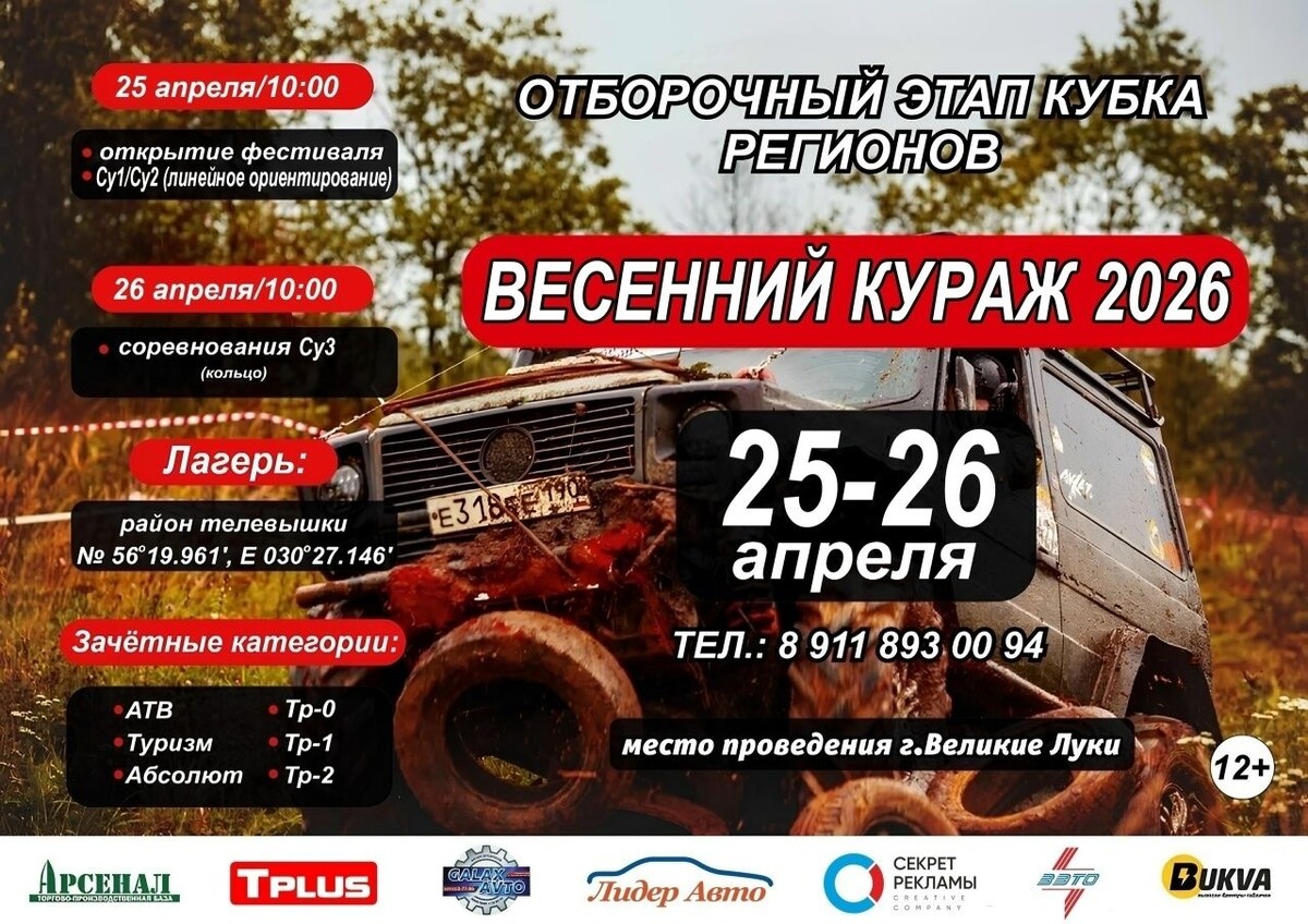 +) 📅 25 апреля в Великих Луках пройдёт фестиваль внедорожной техники «Весенний кураж 2026» (12+). Мероприятие станет отборочным этапом Кубка регионов. 🏆 Старт соревнований в 10:00. Участников ждут специальные участки различной сложности и борьба за выход в Кубок регионов. Категории: ATB, Тр-0, «Туризм», Тр-1, «Абсолют» и Тр-2. 📍 Полевой лагерь для участников и гостей развернут в районе телевышки. Координаты: 56°19.961’ северной широты, 30°27.146’ восточной долготы. ⚠️ Организаторы рекомендуют заранее подготовить снаряжение для активного отдыха. 👉 ВЛуки.ру | MAX