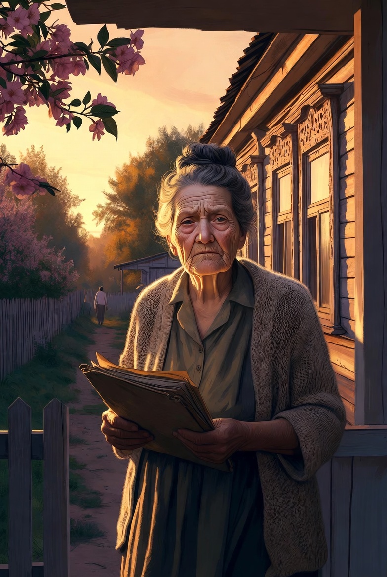 В тот вечер, после их отъезда, она долго сидела на крыльце. В руках — старая фотография: она молодая, с двумя малышами на руках, муж обнимает за плечи. Дом на заднем плане ещё новый, с блестящей крышей. Слёзы тихо катились по щекам.