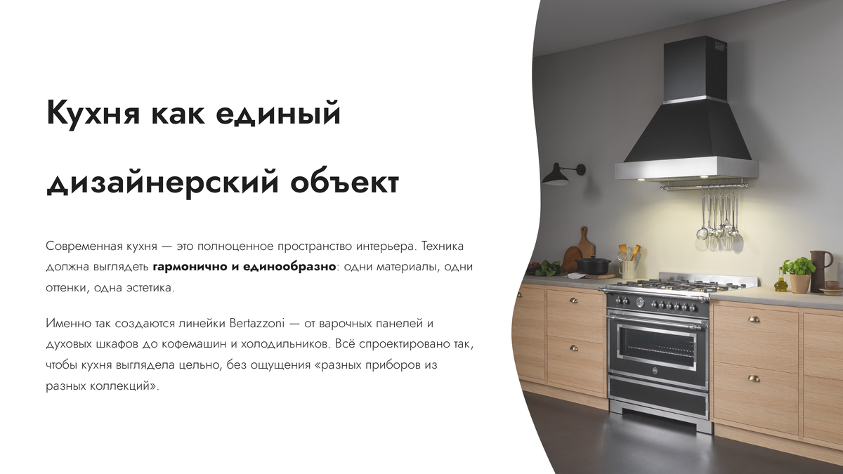 Еще несколько лет назад бытовую технику для кухни часто подбирали по принципу «что лучше по функциям». Сегодня подход меняется: дизайнеры все чаще создают кухни, где вся техника: от духовки до кофемашины выполнена в одном стиле и от одного бренда. Кухня как единая дизайнерская система. И один из брендов, который активно развивает эту концепцию, — итальянский Bertazzoni. Современная кухня все чаще воспринимается как полноценное пространство интерьера. Поэтому техника должна выглядеть гармонично и единообразно. В линейках Bertazzoni: индукционные и газовые варочные панели, духовые шкафы, компактные духовые шкафы, варочные центры, вытяжки, холодильники и морозильники, посудомоечные машины, кофемашины, ящики для подогрева. Они созданы так, чтобы сочетаться между собой по дизайну и материалам. Благодаря этому кухня выглядит цельно и аккуратно, без ощущения «разных приборов из разных коллекций». В современной кухне Bertazzoni можно увидеть несколько ключевых элементов: Духовые шкафы
