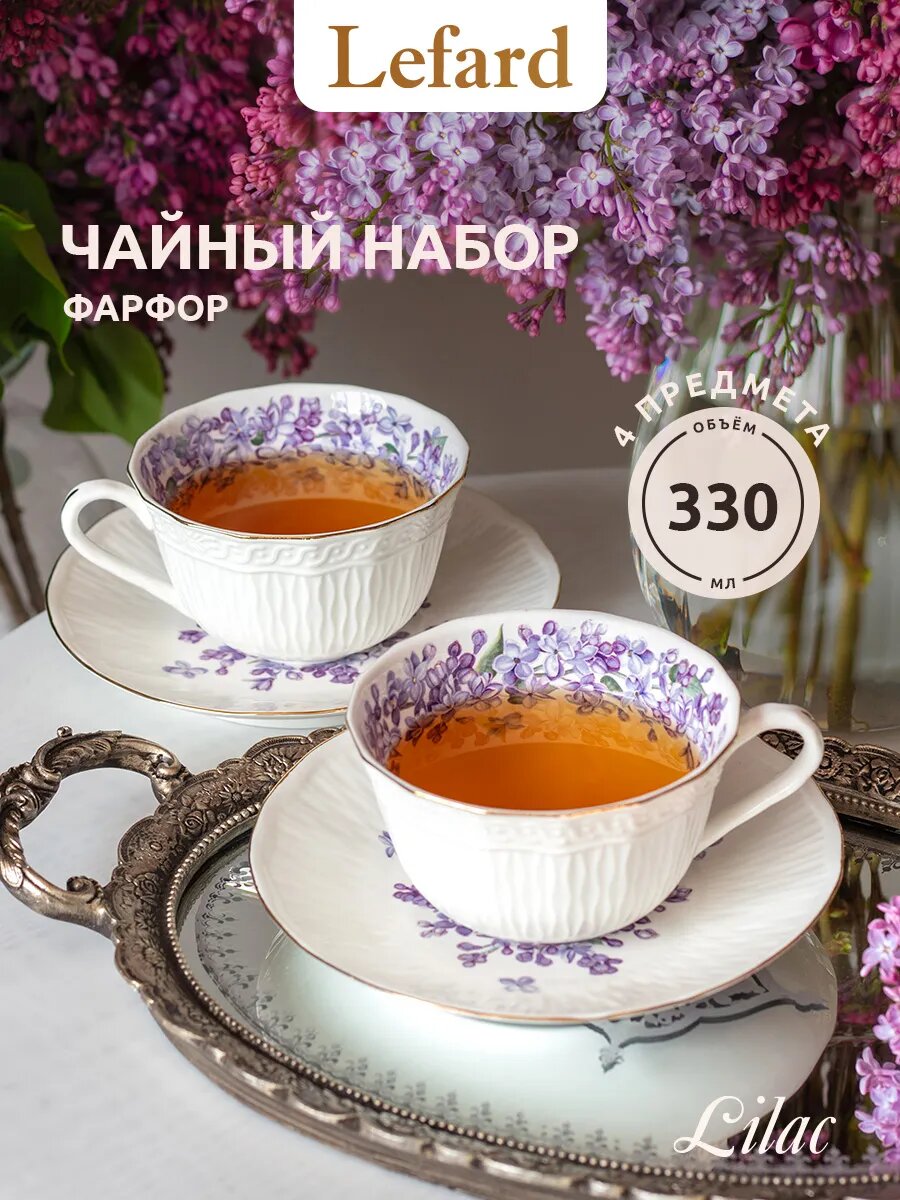 Чайный набор на 2 персоны из коллекции "Lilac" от Lefard. Фарфоровая пара с чашкой и блюдцем объемом 330 мл.