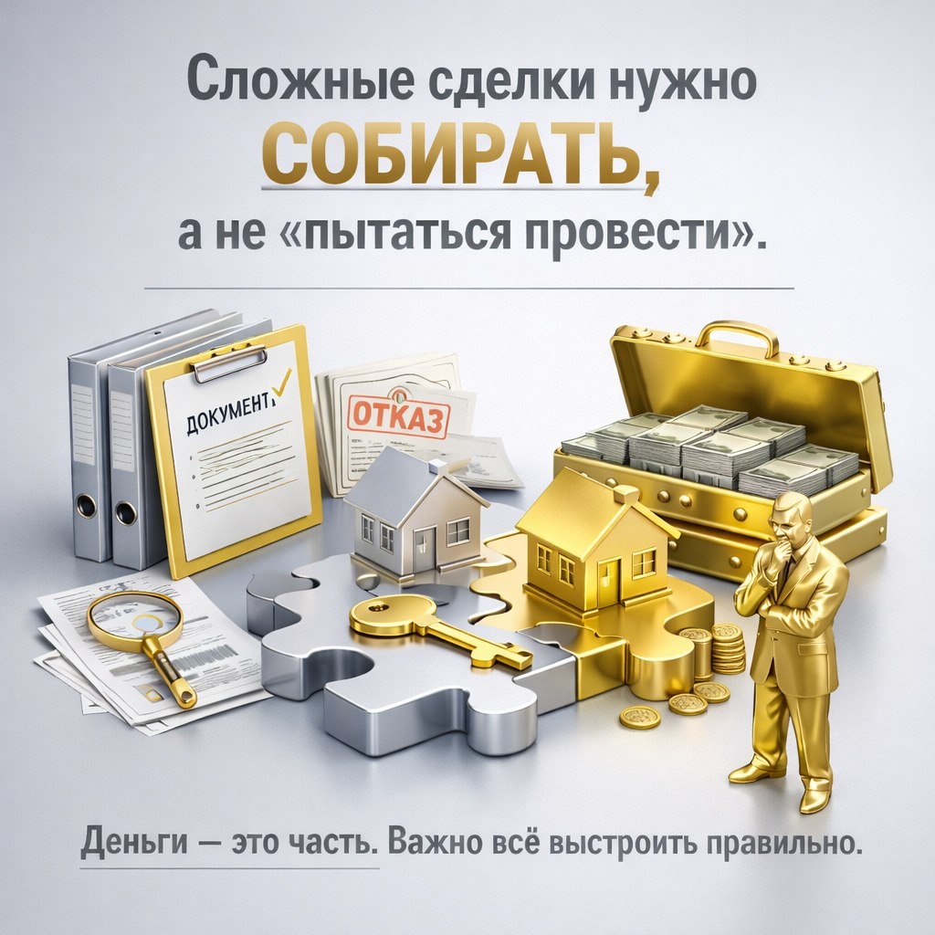 Вчера говорили: сделка срывается не из-за цены и не из-за клиента. Сегодня — ответ. ➡️90% проблем — в документах И чаще всего — в мелочах, которые “кажутся неважными”. ❌Ошибка в площади ❌Старая выписка ❌Несостыковки в БТИ ❌Неучтённая перепланировка И всё. Сделка останавливается. 📌Как это выглядит на практике Покупатель готов. Деньги есть. Все согласны. Но одна бумага — и Росреестр говорит: “отказ”. ➡️1 ошибка = стоп сделки И это только начало. Завтра разберём: Почему сложные сделки нужно собирать, а не пытаться провести