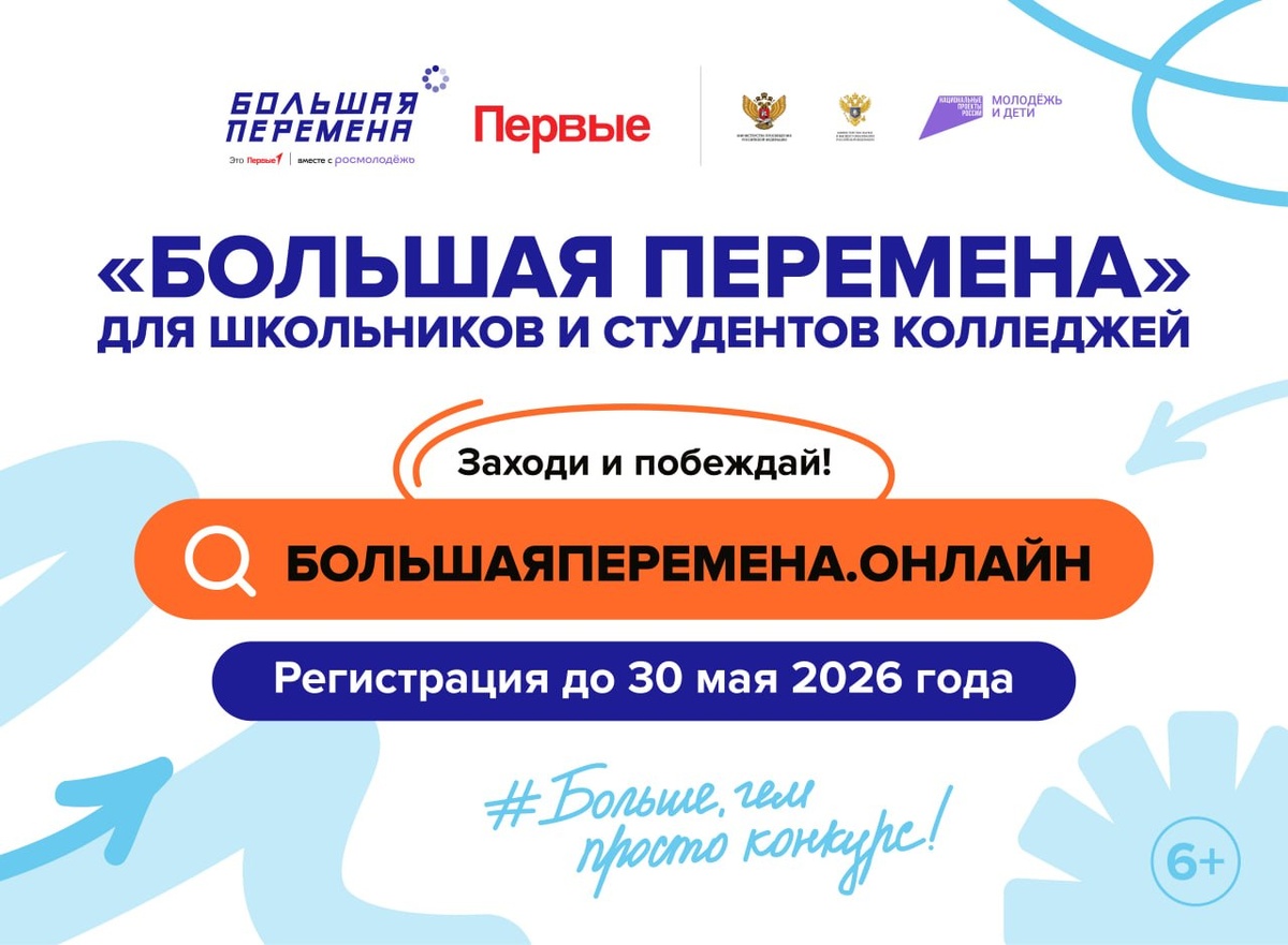 ! Спешим сообщить о серии открытых уроков в рамках популяризации Всероссийского конкурса «Большая перемена» — проекта, который помогает раскрыть себя, найти единомышленников и попробовать свои силы в масштабных инициативах. Участники региональной команды, наставники, кураторы, победители и выпускники конкурса делятся реальным опытом, рассказывают, как готовиться к этапам, и показывают, какие возможности открывает участие. Участников ждёт: — практические советы по прохождению конкурса; — ответы на вопросы; — реальные истории успеха; — возможность понять, с чего начать именно тебе. 📌 Сейчас уже доступен формат участия — открытые уроки онлайн 🔗 ССЫЛКА НА РЕГИСТРАЦИЮ Если ты давно хотел заявить о себе — это отличный старт. «Большая перемена» - это проект для тех, кто не ждёт возможностей, а создаёт их сам. #ДвижениеПервых #ДвижениеПервыхКрым #БольшаяПеремена