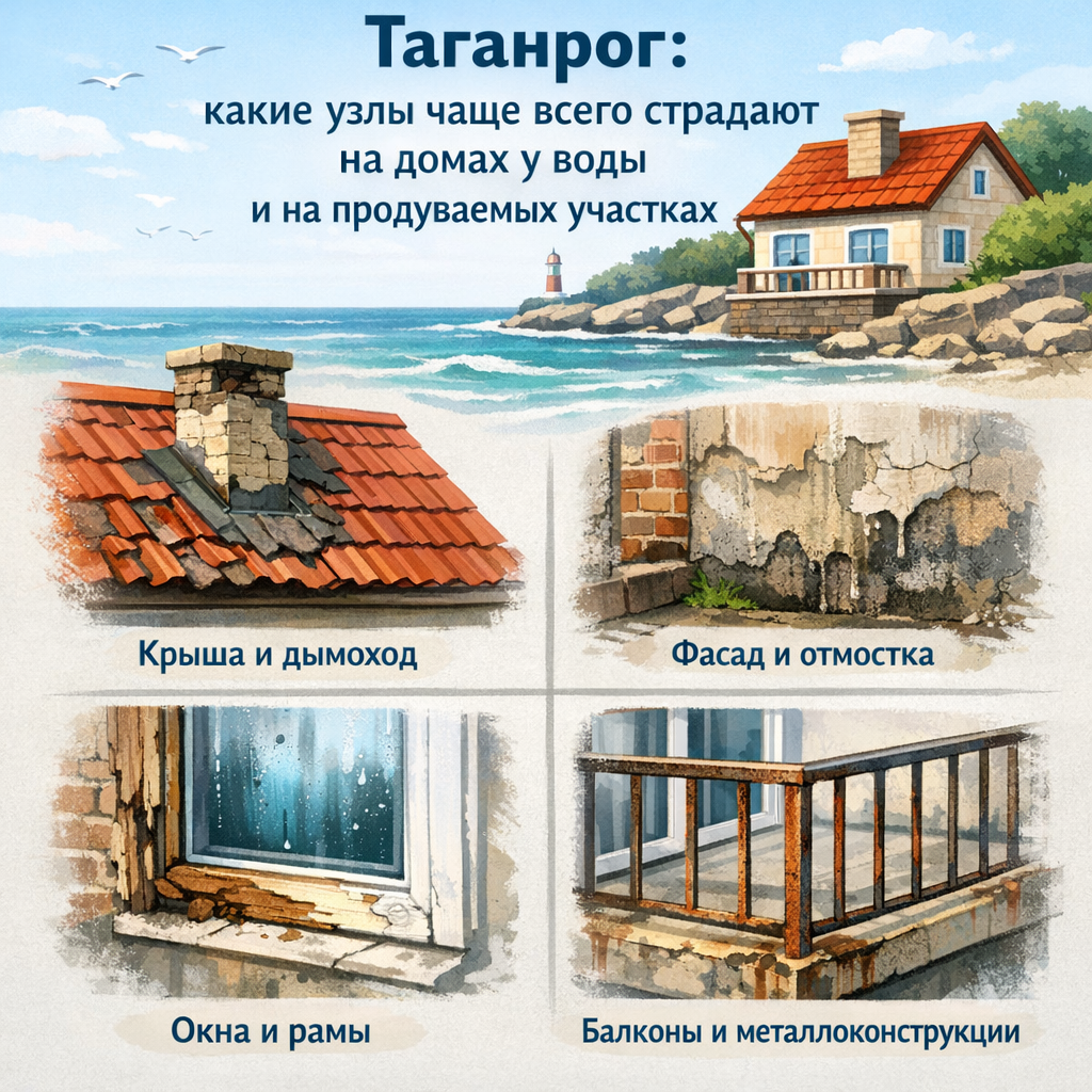 На домах у воды и на продуваемых участках чаще всего страдают не “стены вообще”, а вполне конкретные вещи: