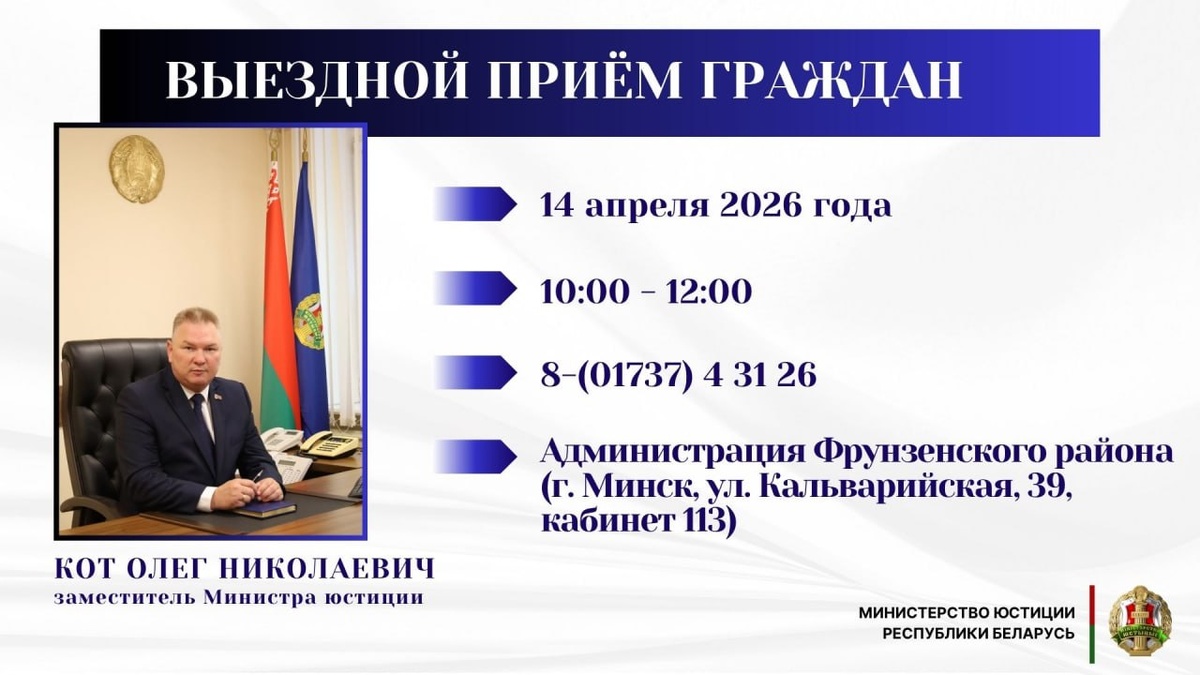 ☎️☎️☎️☎️☎️☎️☎️☎️ 🗓 14 апреля 2026 г. с 10:00 до 12:00 заместитель Министра юстиции Республики Беларусь Кот Олег Николаевич проведет выездной прием граждан в администрации Фрунзенского района г. Минска (г. Минск, ул. Кальварийская, 39, каб. 113) по вопросам, относящимся к компетенции Министерства юстиции. 📞 Предварительная запись на прием будет осуществляться через администрацию Фрунзенского района г. Минска по телефону: 8 (017) 3743126. 💪💪💪💪| Сайт | Telegram | Instagram | YouTube