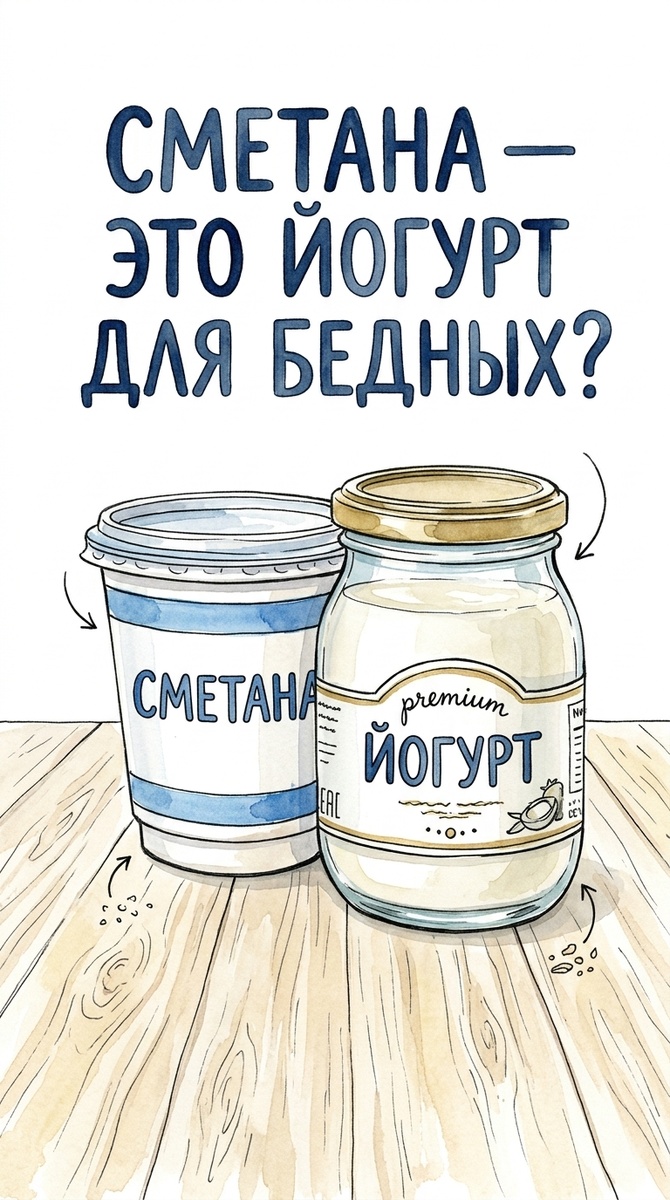 Завис недавно в магазине перед полкой с молочкой: слева — йогурт, справа — сметана. На вид и вкус — почти одно и то же, текстура — ну практически один в один. Только этикетки разные: у сметаны привычная нам, а у йогурта красивая, чем-то даже "элитная". Невольно задался вопросом: а не пытаются ли нас обмануть маркетологи? Может, йогурт — это просто обезжиренная сметана в красивой упаковке? Как оказалось — не совсем. В основе любого кисломолочного продукта лежит ферментация. Бактерии перерабатывают лактозу в молочную кислоту, что меняет структуру белка. Так получается продукт, который мы знаем — йогурт, сметана, кефир, ряженка или простокваша. Но если база общая, то почему на выходе мы получаем такие разные продукты? Потому, что итоговый результат определяют три фактора: тип закваски, температура и жирность сырья. И здесь мы возвращаемся к нашим продуктам. Разница между ними начинается ещё на старте: Сметану делают из жирных сливок. Чтобы она заквасилась, нужны умеренное тепло (около 25