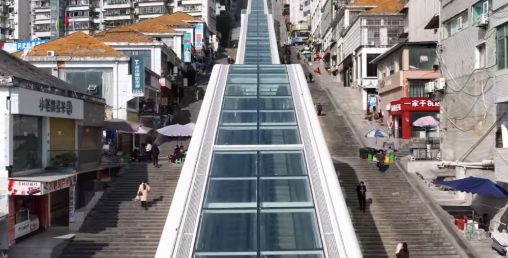 В уезде Ушань, расположенном в провинции Чунцин, Китай, была открыта самая длинная в мире уличная система эскалаторов. Длина этой системы составляет около 900 метров, а перепад высоты достигает 244 метров, что сопоставимо с высотой 80-этажного небоскрёба. Комплекс, получивший название «Богиня» («Goddess»), включает в себя 21 эскалатор, 8 лифтов, 4 траволатора и несколько пешеходных мостов. Полный путь по системе занимает примерно 21 минуту, в то время как ранее прохождение этого маршрута пешком занимало около часа. Ежедневно систему используют около 9 000 человек, стоимость поездки составляет 3 юаня (примерно 40 центов). Главный инженер проекта, Хуан Вэй из компании China Railway Eryuan Engineering Group, отметил, что аналогичных сооружений в стране нет — ни готовых, ни находящихся на стадии строительства. Горный рельеф Чунцина делает транспортную инфраструктуру региона особенно сложной. Например, поезда здесь проходят прямо через жилые здания, а станции метро расположены глубже некот