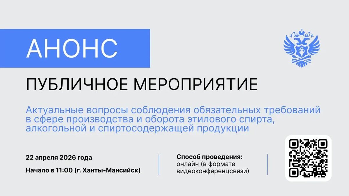 , что 22 апреля 2026 года в 11:00 (г. Ханты-Мансийск) планирует проведение публичного мероприятия. Тема мероприятия «Актуальные вопросы соблюдения обязательных требований в сфере производства и оборота этилового спирта, алкогольной и спиртосодержащей продукции». 📌 Подробнее о мероприятии и регистрации на сайте: https://clck.ru/3SzBiv #Анонс #УрФО Росалкогольтабакконтроль МАХ | ВКонтакте | Telegram