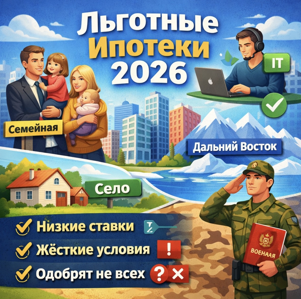 Ошибся — и банк просто не одобрит. Для сотрудников аккредитованных IT-компаний. 📉 Ставка: около 6% 📌 Особенности: 👉 Подходит не всем, но если проходите — это один из самых выгодных вариантов. 📉 Ставка: от 2% 📌 Но: 👉 Очень выгодно, но география сильно ограничивает. 📉 Ставка: 0,1–3% 📌 Условия: 👉 На практике подходит далеко не всем, но ставка — одна из самых низких. 📉 Ставка: от 6% 📌 Только для участников НИС (военнослужащие). 👉 Рабочий инструмент, но узкая категория