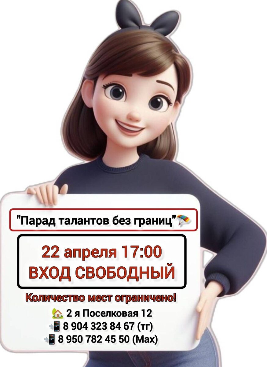Мероприятие для детей, где каждый может проявить свои таланты в пении, танцах, чтении стихов, игре на музыкальных инструментах и многом другом. Участие бесплатное, оргвзнос 100 рублей. Начало: 22 апреля 2026 17:00 Стоимость: Бесплатно Адрес: г Омск, ул 2-я Поселковая, д 12 Организатор: https://vk.com/public153176439 Самое зрелищное мероприятие апреля «Парад Талантов без границ» ⭐У каждого таланта есть своя звезда!⭐ 👉 Это не конкурс «кто лучше», а способ проявиться, показать себя! У каждого ребенка есть уникальная «звезда» (талант). Мы не сравниваем детей, мы показываем, как в нашем центре помогают этой звезде засиять ещё ярче! 🎤 Что можно показать: • Пение 🎵 • Танцы 💃 • Стихи • Игру на музыкальных... #словесность_литература,_поэзия #развлечения_танцевальные_выступления #хореография_бальные_танцы Узнать подробности, адрес или записаться на событие.