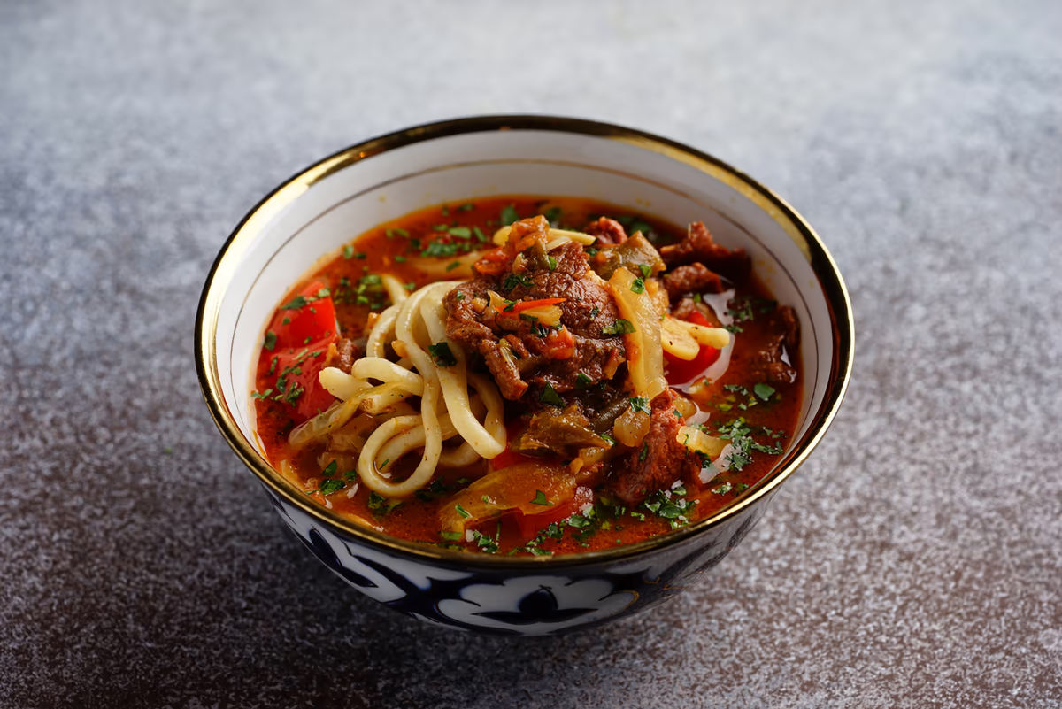 Замесить тесто и дать ему полежать 3–4 часа. Затем, чтобы увеличить вязкость и тягучесть теста, перемешать его, смазывая крепким раствором соли и питьевой соды. Дать тесту снова расстояться, затем кусок теста весом примерно в 3 кг смазать раствором соли и соды, раскатать в виде батона и вытягивать его несколько раз, складывая и снова вытягивая до тех пор, пока отдельные его нити не будут иметь толщину тонких макаронов. Полученную таким образом лапшу отварить в кипящей солёной воде. Мясо баранины или говядины нарезать тонкими брусочками, как на бефстроганов, посыпать перцем, слегка обжарить и продолжить жарку с добавлением шинкованного лука, редьки и томата-пюре, рубленого чеснока, всё это залить бульоном и варить 20–30 минут. При подаче к столу лапшу разогреть и залить соусом. Уксус подать отдельно. На 120 г пшеничной муки: соды — 2 г., мяса — 153 г., сливочного масла — 30 г., репчатого лука — 20 г., томата-пюре — 10 г., редьки — 70 г., болгарского перца — 30 г., чеснока — 8 г., 3%-го
