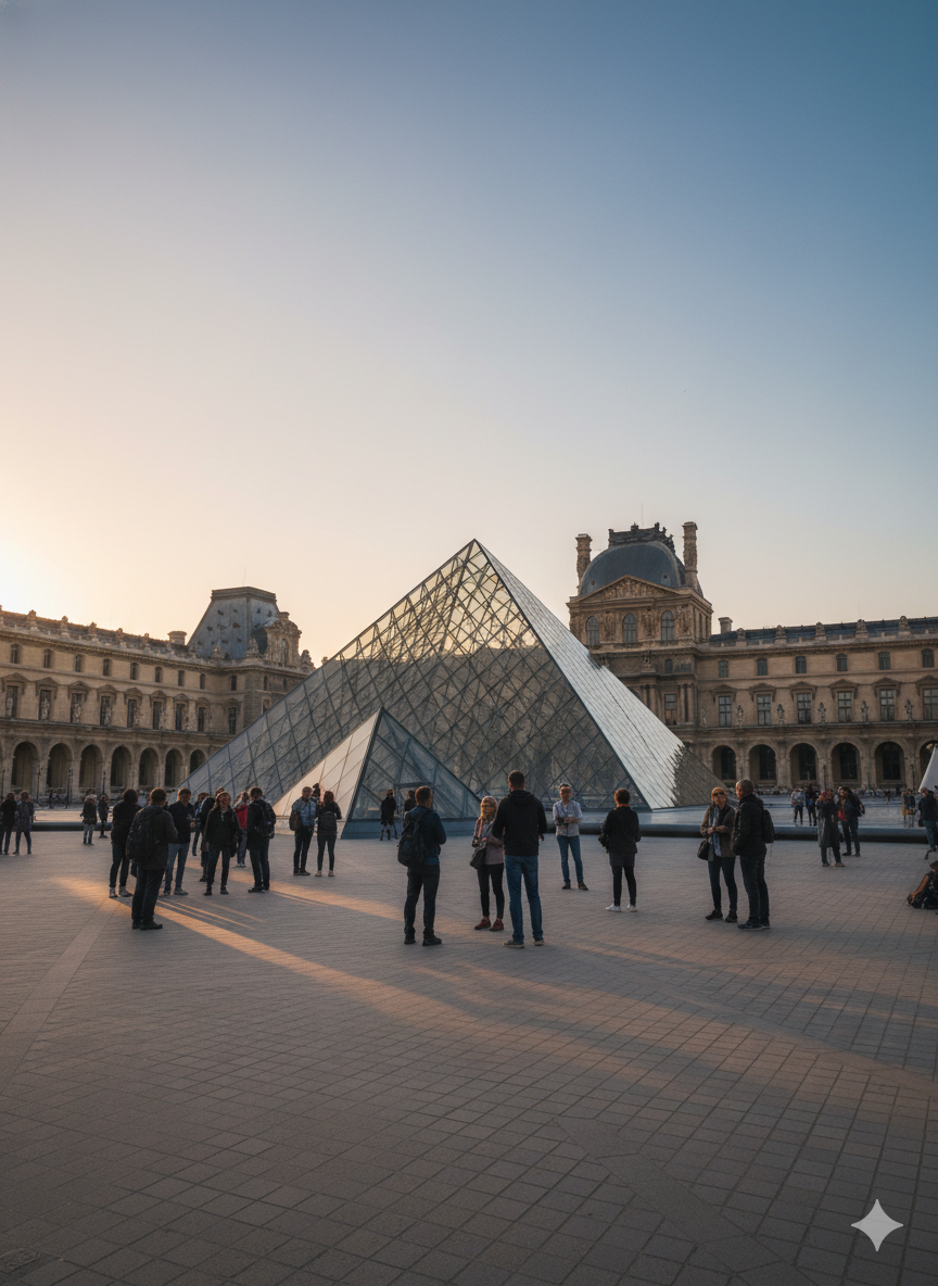 Главный вход в музей — и сам по себе один из самых узнаваемых образов Парижа. Среди величественных каменных фасадов королевского дворца эта прозрачная геометрия кажется пришельцем из будущего — и именно в этом её магия.