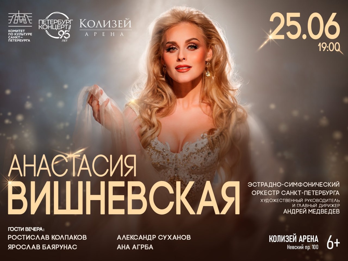 Анастасии Вишневской! ✨ Всего за несколько лет в культурной столице артистка стала настоящей сенсацией театрального мира, завоевала уважение коллег, снискала любовь и восхищение зрителей, исполнив главные партии в самых громких петербургских мюзиклах: в мистическом «Мастере и Маргарите» и масштабном «Петре I», в пронзительной «Даме Пик» и вечной истории любви «Ромео и Джульетты». За выразительное музыкальное сопровождение в этот вечер отвечает Эстрадно симфонический оркестр Санкт Петербурга под управлением Андрея Медведева. Насыщенные оригинальные аранжировки, неповторимый дирижерский почерк, современное звучание превращают каждое выступление оркестра в суперформатное эстрадное шоу. Дополнительная интрига вечера — выступления приглашенных звезд: Ростислава Колпакова, Ярослава Баярунаса, Александра Суханова и Аны Агрба. 🎫 Билеты на грандиозный концерт: 25.06 | 19:00 | Сольный концерт Анастасии Вишневской