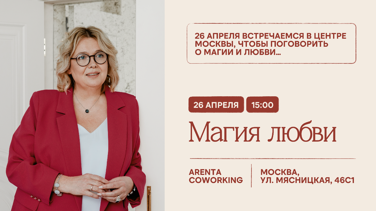 Дорогие друзья! 26 апреля 2026 года я приглашаю вас на встречу, посвящённую магии любви. Да-да, я не оговорилась. Именно магии. Об этом мало говорят, но волшебство и любовь проявляются на одних и тех же движках. Когда я говорю о волшебстве (или о магии), то это, конечно, не «крибли-крабли-бумс дайте мне сейчас же слиток золота». Я говорю о способности «творить миры и писать историю», когда мысли и слова человека обретают материальность, а судьба подчиняется его планам. То, о чём я сейчас рассказываю, является Божественной составляющей нашей личности. Помните? «Бог-Творец – есть любовь»…, «Человек создан по образу и подобию Божию». Почему же мы все не стали волшебниками? Потому же, почему лишь единицы из миллионов способны подняться от влюблённости к истинной любви. Люди не понимают природу любви, они нарушают её законы (кстати, очень простые) и теряют удивительную силу, данную им от рождения. Как понять магическую природу любви и научиться любить? У меня хорошая новость. Тот самый курс