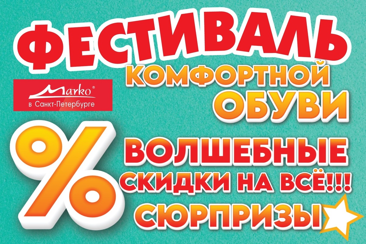 ! Спешим пригласить Вас на Фестиваль Комфортной обуви в дни самых выгодных покупок! Фестиваль пройдет -с 16 по 19 АПРЕЛЯ 2026 г. в магазинах "МАРКО ОБУВЬ" на пр. Стачек 96 и Б. Зеленина 2/42 (Вход с Ропшинской ул.) -с 23 по 26 АПРЕЛЯ 2026 г. в магазинах "МАРКО ОБУВЬ" на 1-ой Красноармейской 24 В.О. 7-я Линия 30 и на Невском пр. 103 Членам Марко Клуба персональные дополнительные скидки по клубной карте! Каждому покупателю сопутствующих товаров волшебный СЮРПРИЗ!