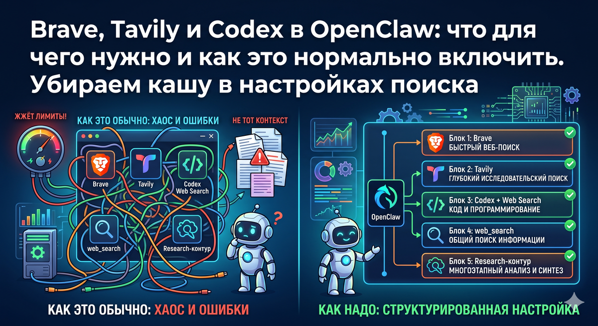 Когда в OpenClaw начинают настраивать поиск, чаще всего всё смешивают в одну кучу: Brave, Tavily, встроенный web-search у Codex, обычный web_search, research-контур. А потом начинается классика: что-то вроде работает, но непонятно, какой слой за что отвечает и почему агент то жжёт лимиты, то тащит не тот контекст.