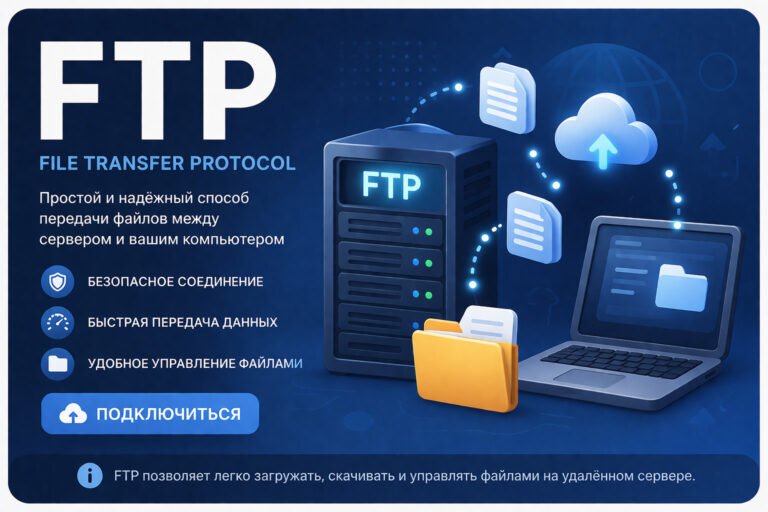 FTP расшифровывается как File Transfer Protocol — протокол передачи файлов. Это один из старейших сетевых протоколов: он появился в начале 1970-х годов и до сих пор используется для загрузки файлов на хостинг, обмена данными между серверами и доступа к файловой системе сайта. Несмотря на возраст, FTP остаётся стандартным инструментом веб-разработчиков и системных администраторов.