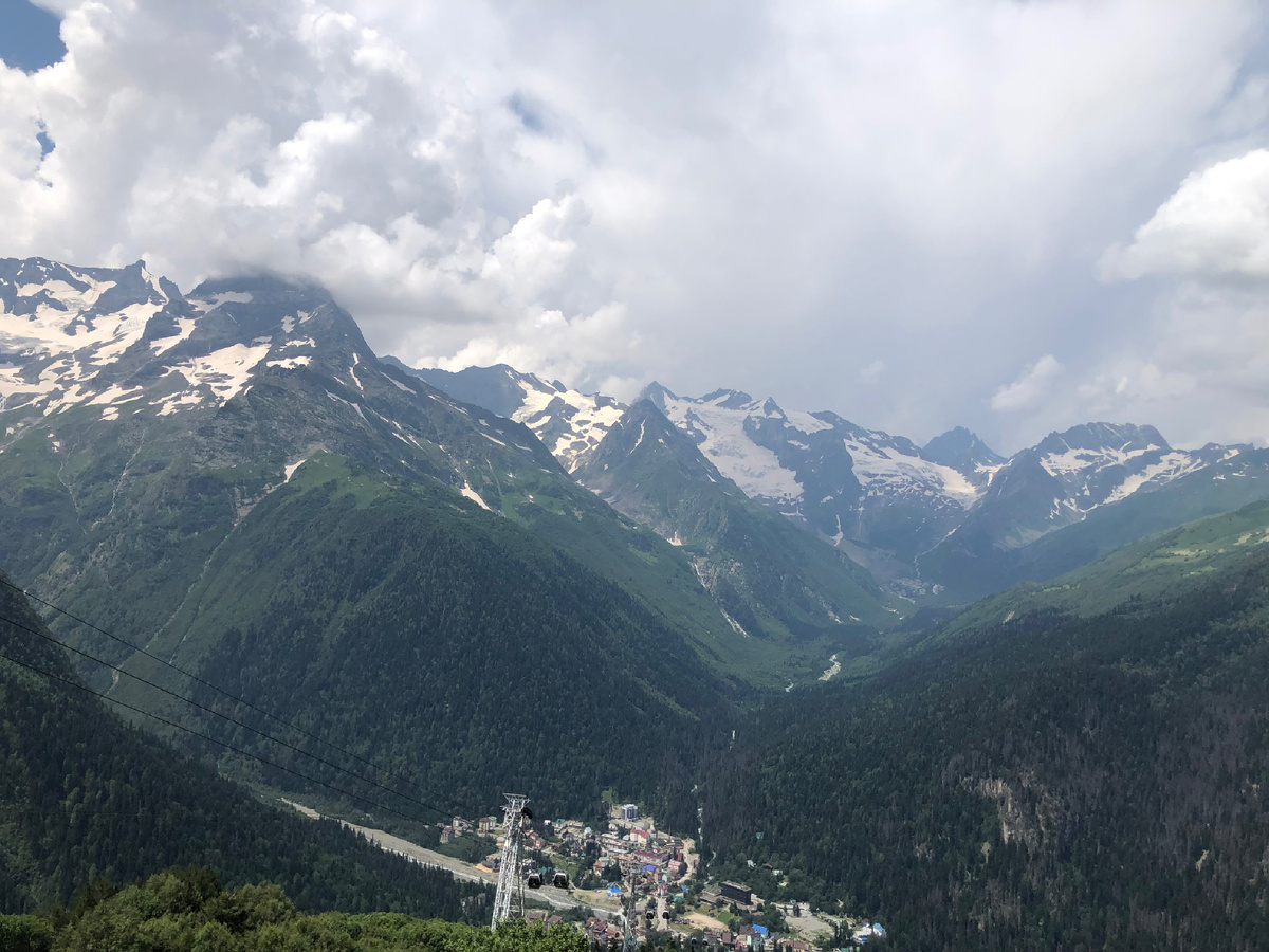 И вот мы в настоящих Кавказских горах. На Домбае. Никогда даже представить не могла, что горы могут быть такими огромными. Это просто фантастика, когда видишь горы, поднимающиеся выше облаков! Да ещё снег лежит, хотя у подножья 30 градусов жары.