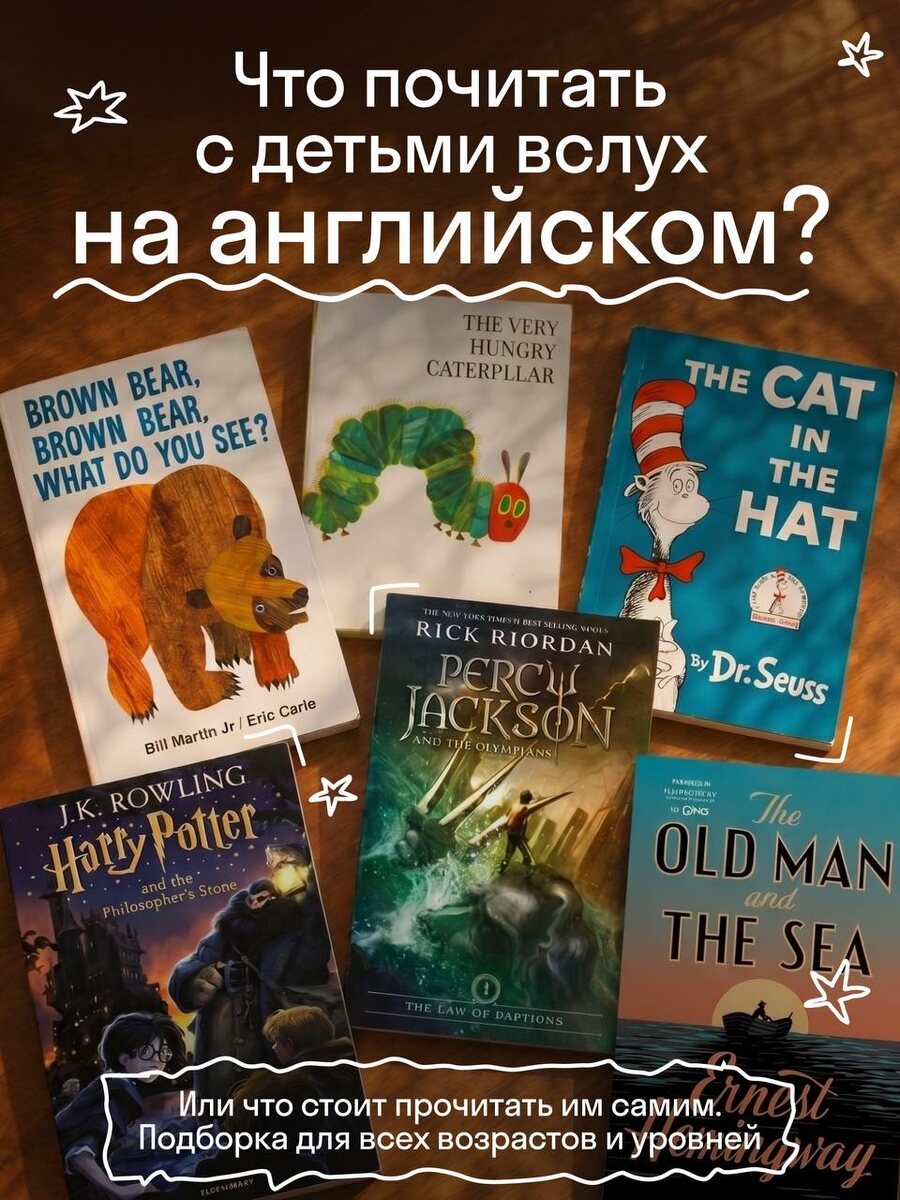 В карточках собрали подборку книг для детей с указанием нужного для чтения уровня языка. Есть варианты и для самых маленьких, и для подростков — в общем, для всех, кто может заниматься английским в Skysmart. А записать ребёнка на занятия уже с 4 лет можно по ссылке 👈🏼