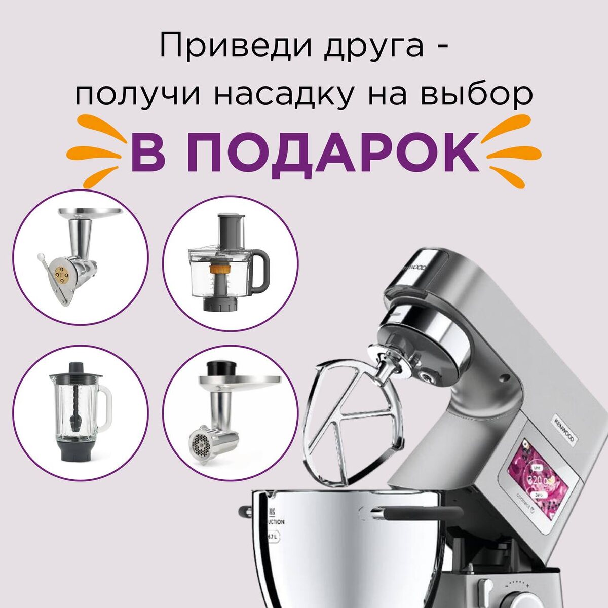 🎁 Порекомендуйте другу покупку Cooking Chef XL и получите любую насадку на выбор. Как получить подарок: ✔️ Зарегистрируйте покупку на сайте Kenwood через специальную форму. ✔️ Через 14 дней после получения вашим другом кухонной машины, вам будет отправлена насадка. Акция действует до 10.05, доставка насадки оплачивается получателем отдельно и составляет 100 рублей. Узнать подробнее возможно на сайте Kenwood.ru.