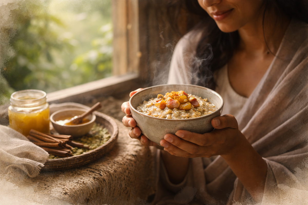 Плотные дни крадут силы. Еда становится врагом. Вздутие. Тяжесть. Сон в тумане. Но есть блюдо, которое меняет сценарий. Овсяная каша с яблоком, гхи и специями. Не просто завтрак. Опорный ритуал. Утро. Чашка в руках. Тепло растекается. Сытость мягкая. День стартует без рывков. Я вижу, как женщины после 40 лет возвращаются к жизни через такие простые шаги. Пробовали диеты. Читали книги. Разбирались в добавках. А потом — эта каша. Лицо светлеет. Шаги увереннее. Овсянка балансирует Вата-дошу. Вата — энергия движения и воздуха. Когда она в дисбалансе, тело мёрзнет. Газы бурлят. Энергия уходит. Овсянка успокаивает. Даёт стабильность. Особенно с гхи — маслом, которое питает ткани изнутри. 🌿 Яблоко протушить. Оно становится сладким. Смягчает сухость Ваты. Корица согревает агни — пищеварительный огонь, силу, что еду в энергию превращает, а не в балласт на весь день. Кардамон или имбирь разгоняют застой. Гхи скользит. Мёд завершает. Ставишь воду или молоко. 250 мл. Овсяные хлопья — 4-5 ложек. В