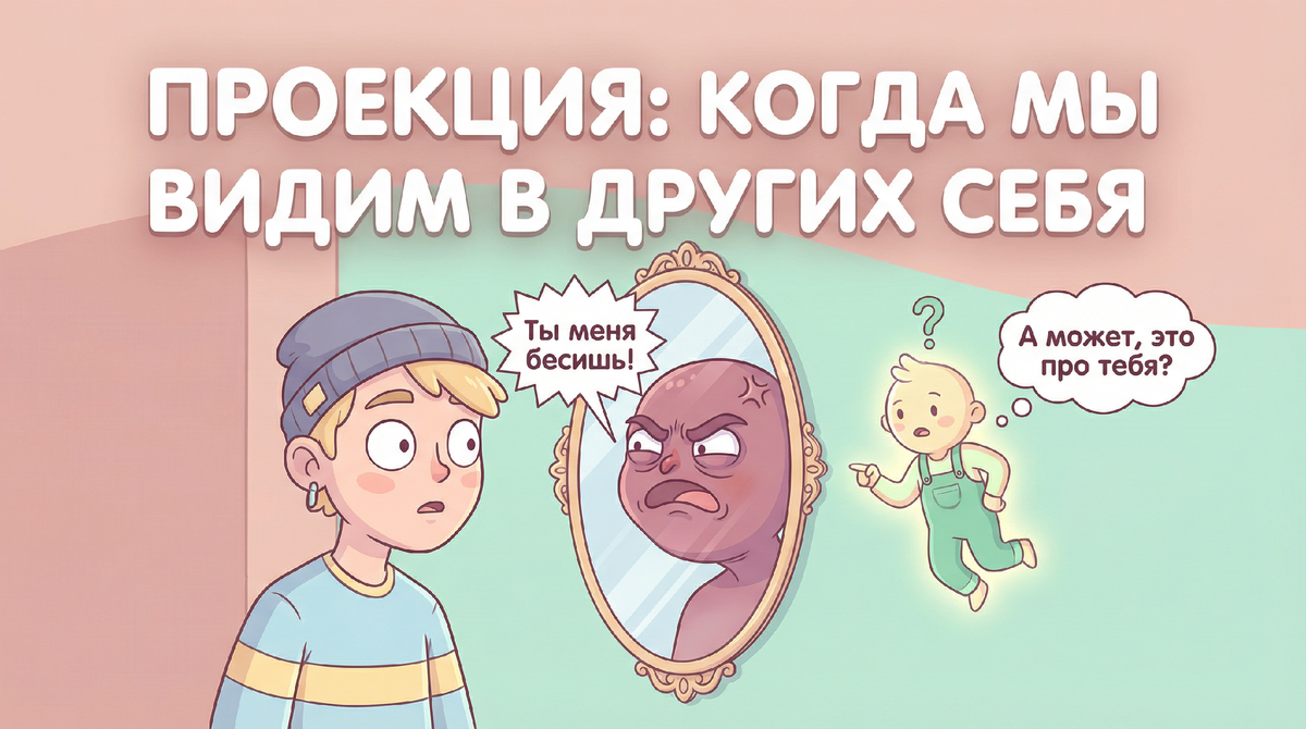 Бывало такое? Коллега хвастается — и вас аж подташнивает. Партнёр ленится — и хочется прибить. Дико бесит какой-то человек, причём на ровном месте, непонятно за что. Так вот, есть большой шанс, что этот раздражающий недостаток — на самом деле ваш собственный. Просто вы его в себе не признаёте или боитесь. В психологии этот фокус называется проекцией. Мы буквально «надеваем» на других людей те свои качества или чувства, с которыми нам самим неудобно. Сегодня разбираемся, как это работает и как перестать воевать с собственным отражением. Это как в кино. Вы берёте свой собственный фильм (например, про свою злость, зависть или страх) и начинаете крутить его на другом человеке, как на белом экране. Вместо того чтобы признаться себе «я ужасно боюсь провала», мы смотрим на коллегу и думаем: «Какой же он нерешительный и слабый!». Так наша психика защищается от неприятной правды о себе. Удобно? Да. Только вот отношения портятся, потому что мы начинаем ругаться не с реальным человеком, а со свое
