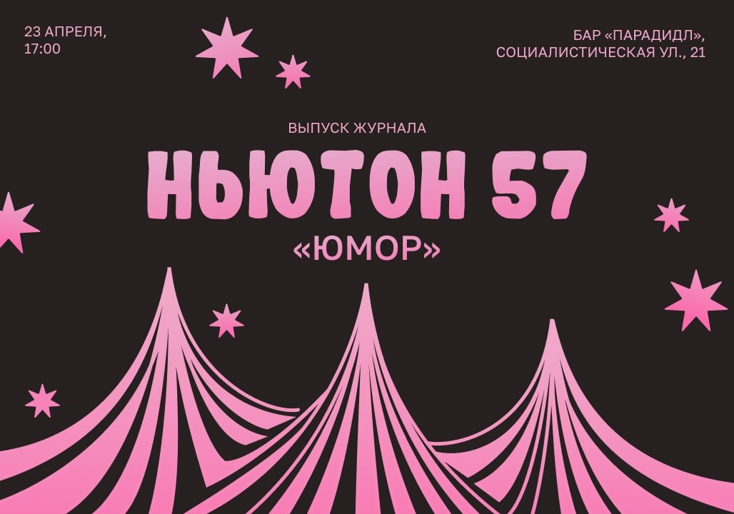🌟 Вместе с релизом нового журнала готовим традиционную встречу на презентации: на ней мы станем чуть-чуть ближе к бессмертию, потому что смеха будет предостаточно. А вот наши причины для веселья: — Выступления стендаперов; — Секретный интерактив (там будет много мемов, только тссс). 🗓 23 апреля, 17:00 📍 Бар Парадидл, Социалистическая ул., 21 🎟 Вход по регистрации (для всех)
