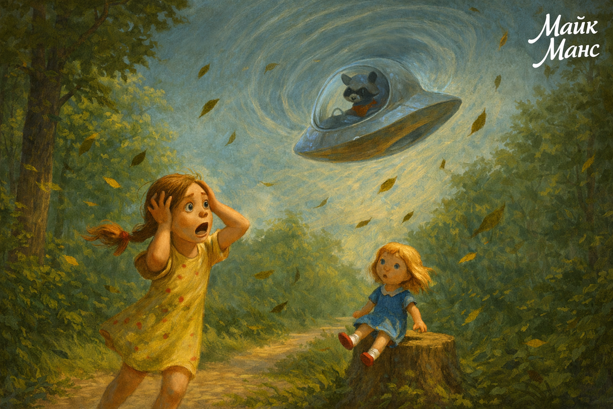 Она посадила Машу на пенек вдоль тропинки, и стала собирать шишки. Настроение у нее было прекрасное. Увы, оно очень быстро испортилось. В этот самый момент, компьютер корабля Ссулса – пришельца с ярко выраженной внешностью и размерами енота, совершил просчет при расчете квантовой вероятности, вынырнул прямо в атмосфере над Тверской областью, получил микро-повреждения из-за внезапно зашкаливших магнитных полей, и, сопровождаемый неслышимым никому воплем своего пилота грохнулся прямо в пыль на лесной тропинке. Увы, от потоков воздуха, внезапно пришедшего в локальную ярость от нарушения причинности, Маша упала с пенька и оказалась прямо на пути корабля, мгновенно расплющившего бедняжку.