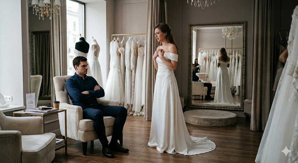 Игорь сидел на бархатном пуфике, скрестив руки на груди. Его лицо не выражало ничего, кроме напряженного подсчета в уме. Он даже не смотрел на нее — его взгляд был прикован к ценнику, который консультант неосмотрительно оставила на маленьком журнальном столике.