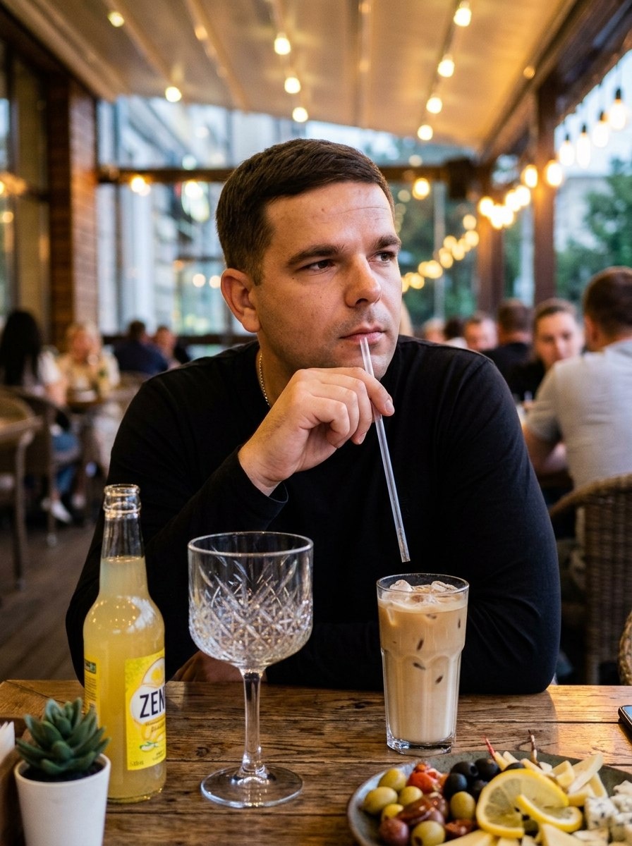 🤖Генерировать можно здесь: 👉БОТ ДЛЯ ГЕНЕРАЦИИ Режим Nano Banana Pro/2 ИНСТРУКЦИЯ > Реалистичная фотография, средний план. Привлекательный мужчина с загруженного фото. Черты лица, форма глаз, цвет волос и общий облик мужчины строго перенесены с загруженного референсного фото - точное сходство обязательно. Он одет в черный лонгслив или джемпер. Мужчина сидит за столиком в уютном ресторане на полуоткрытой террасе вечером, его взгляд задумчиво направлен вправо от камеры, в руке он небрежно держит длинную прозрачную трубочку для коктейля, поднося ее к лицу. > > На переднем плане на столе детально прорисованы предметы: бутылка желтого газированного напитка с этикеткой "ZEN", большой пустой хрустальный бокал с гранями, стакан с холодным кофейным напитком (айс-латте) со льдом, маленький декоративный горшок с суккулентом и сервированная тарелка с закусками (оливки, лимоны, сыр). > > Фон, на заднем плане видны силуэты других посетителей и теплые огни ресторана. Атмосфера вечерняя, расслабленна