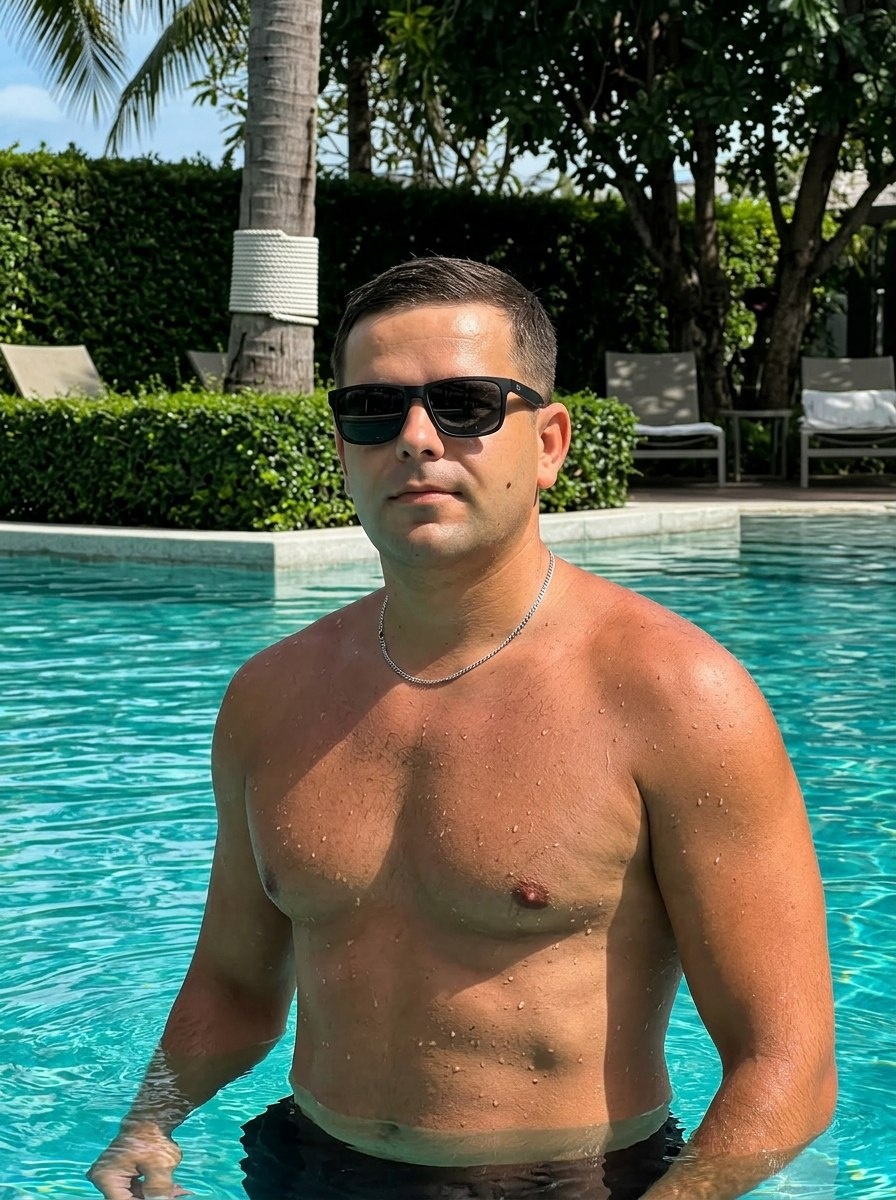 🤖Генерировать можно здесь: 👉БОТ ДЛЯ ГЕНЕРАЦИИ Режим Nano Banana Pro/2 ИНСТРУКЦИЯ > Реалистичная фотография, средний план. Привлекательный спортивный мужчина с загруженного фото, стоит в бассейне, погруженный в воду по грудь. Он одет в черные солнцезащитные очки прямоугольной формы и носит тонкую серебряную цепочку на шее. Тело загорелое, мускулистое, на коже видны капли воды. Взгляд уверенный и спокойный, направлен немного в сторону от камеры, лицо невозмутимое. > > Фон: кристально чистая бирюзовая вода бассейна с легкой рябью. На заднем плане видна ухоженная территория курорта: темно-зеленая живая изгородь, ствол пальмы, обмотанный белой веревкой, и тенистые деревья с листвой, за которыми угадывается мебель для отдыха на террасе. > > Освещение: яркое естественное дневное солнце, создающее контрастные тени и красивые блики на воде и мокрой коже. Высокое качество, фотореализм, 8k, четкая детализация. Стиль: lifestyle, отпуск в люксовом отеле. Вертикальный формат --ar 3:4. СГЕНЕРИРОВАТ