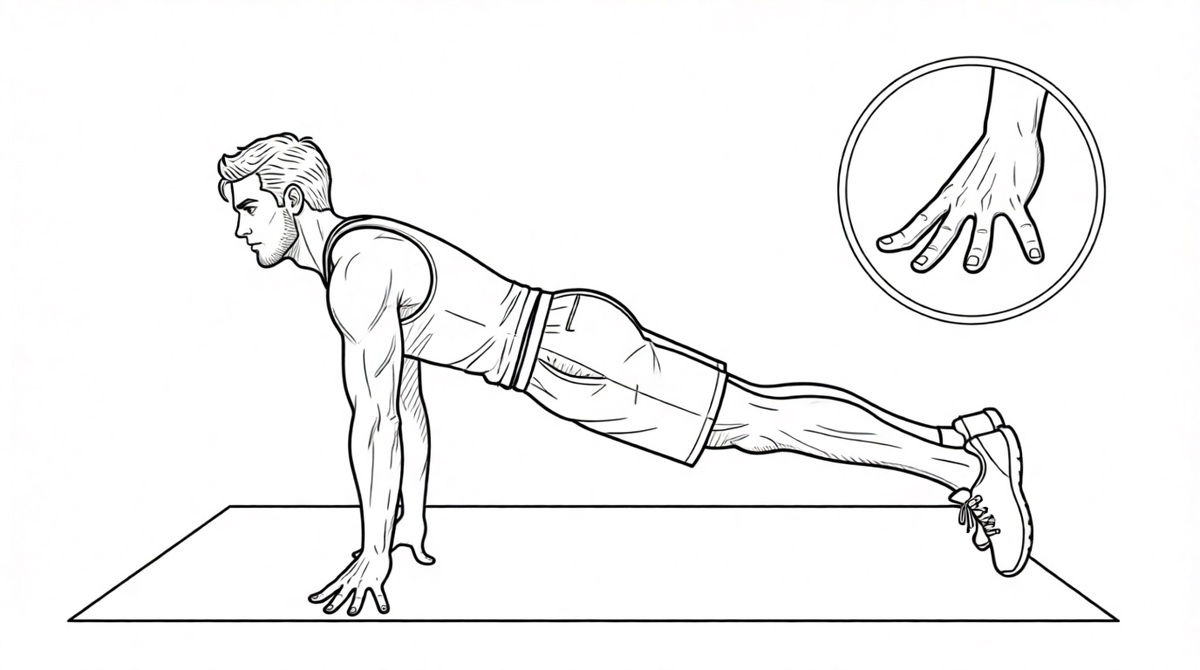 2. Статика на пальцах (1–2 недели). Встаньте в планку на пальцах, стараясь распределить вес равномерно. Начните с 10–15 секунд, постепенно доводя до 30–45 секунд за подход.