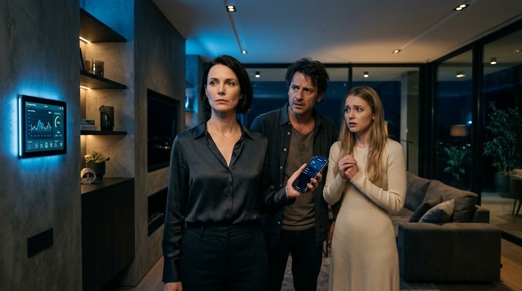 Лиза смотрела на экран планшета, где две красные точки метались по плану её гостиной. Одна точка обозначала Артёма. Вторая, Карину. Они рвались к стеклянной двери на террасу, дёргали ручку, стучали ладонями, а дверь даже не дрогнула.