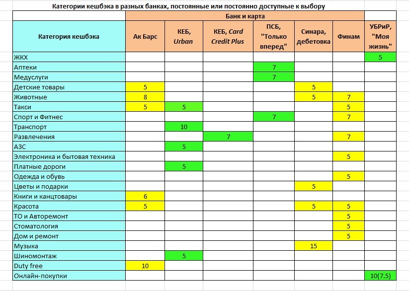 В таблице приводятся категории кешбэка от 5% и выше, зеленым
