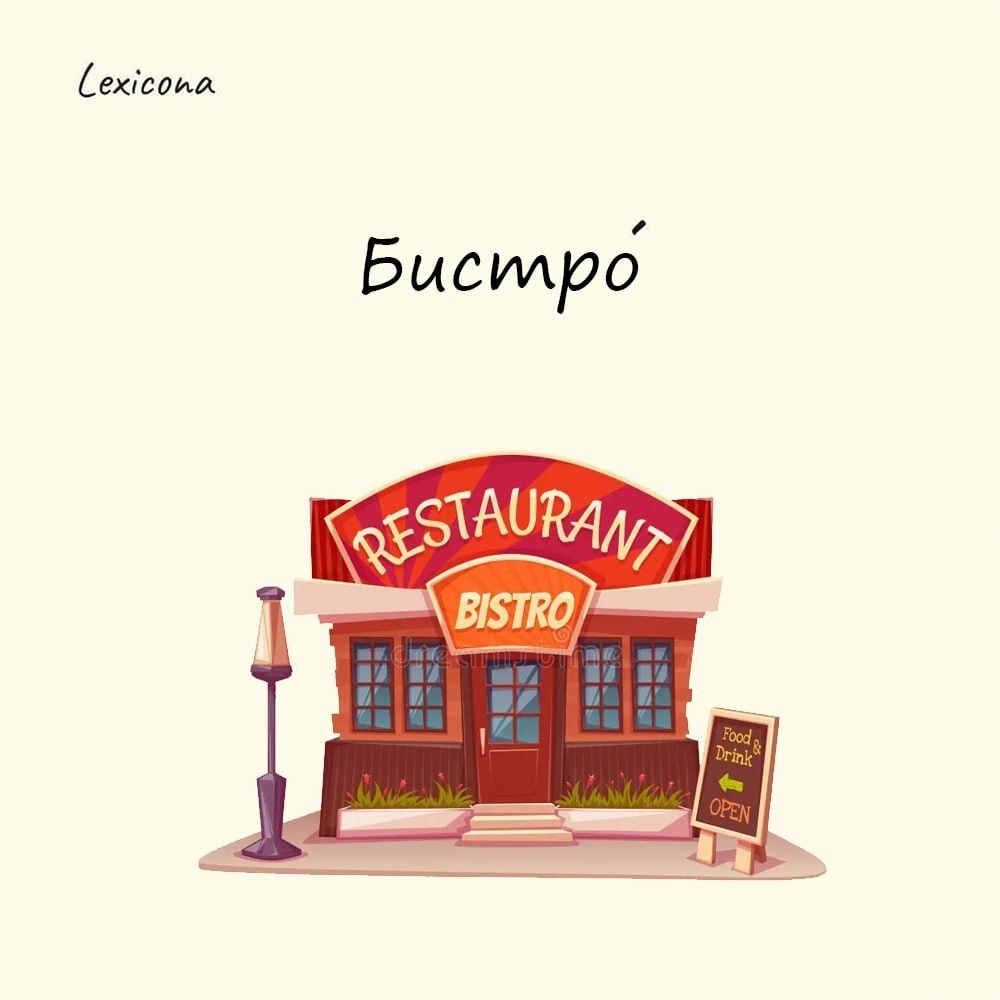 Происхождение этого слова связано с русским словом «быстро». Согласно этой версии, во время взятия Парижа 1814 года русские казаки требовали от французских официантов, чтобы те их обслуживали побыстрее, и подгоняли окриками: «Быстро! Быстро!». Французы переделали русское восклицание на свой лад, так и появилось название для заведений с меню из несложных блюд и быстрым обслуживанием посетителей.