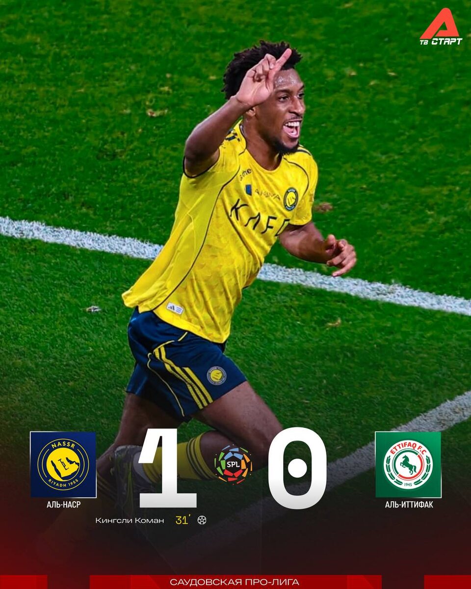 ! Очередная победа команды Криштиану Роналду. На этот раз одолели звездный «Аль-Иттифак» с Дембеле и Вейналдумом в чемпионате. Единственный гол на счету Комана 😎 Подписывайся на ТВ СТАРТ в MAX📲