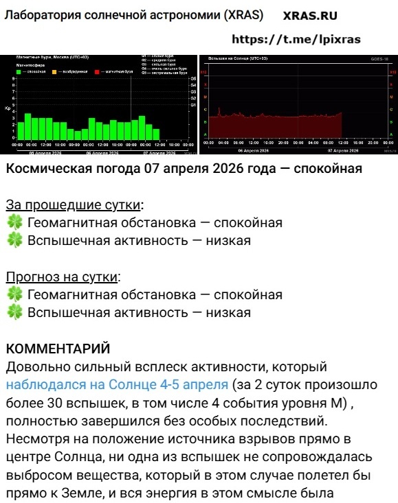 ЛАБОРАТОРИЯ СОЛНЕЧНОЙ АСТРОНОМИИ РАН СООБЩИЛА, ЧТО 4, 5 АПРЕЛЯ НА СОЛНЦЕ БЫЛ "СИЛЬНЫЙ ВСПЛЕСК АКТИВНОСТИ" С ИСТОЧНИКОМ "ПРЯМО В ЦЕНТРЕ СОЛНЦА". ПРИ ЭТОМ НА ДАННЫЙ МОМЕНТ ВСПЫШКИ ПРОШЛИ ДОВОЛЬНО БЕЗОПАСНО. Примечание: 8 апреля, появилась информация в Телеграм канале Лаборатории РАН https://t.me/lpixras , что в Солнце (либо рядом к Солнцу) летит очередная комета по траектории, примерно совпадающей с кометой С/2026 A1 MAPS. Будет ли не опасна эта комета, будет известно в последующие дни.