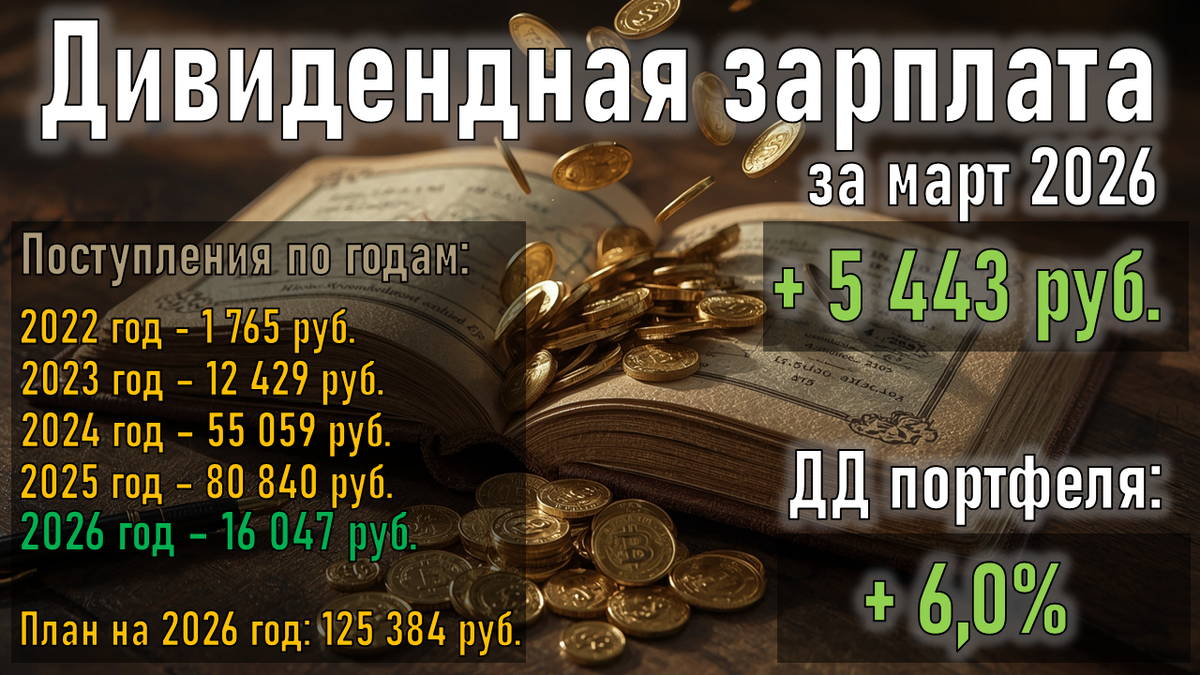 Март — месяц, когда природа окончательно пробуждается от зимней спячки (во всяком случае в Крыму), а инвесторы получают первые по-настоящему весенние выплаты. Этот март не стал рекордным по сумме, но он стал образцовым с точки зрения точности прогноза и дисциплины реинвестирования. 🚀 На брокерский счёт поступило 5`442,96 ₽ — рубль в рубль против плана. Абсолютное попадание в ожидания случается нечасто, и март 2026 войдёт в историю как месяц, где реальность полностью совпала с расчётами (было не сложно - все выплаты фиксированные). Главная интрига заключалась не в размере выплат, а в том, как эти средства и добавленные пополнения были направлены в рынок. В этой статье мы детально разберём, какие эмитенты порадовали выплатами, как двигались деньги, во что были вложены все свободные средства и как изменилась стоимость портфеля по итогам марта. План на месяц составлял 5`442,96 ₽ — фактический результат полностью совпал с ожиданиями. Отклонение — 0 ₽, выполнение плана — 100% 🟢. Абсолютное