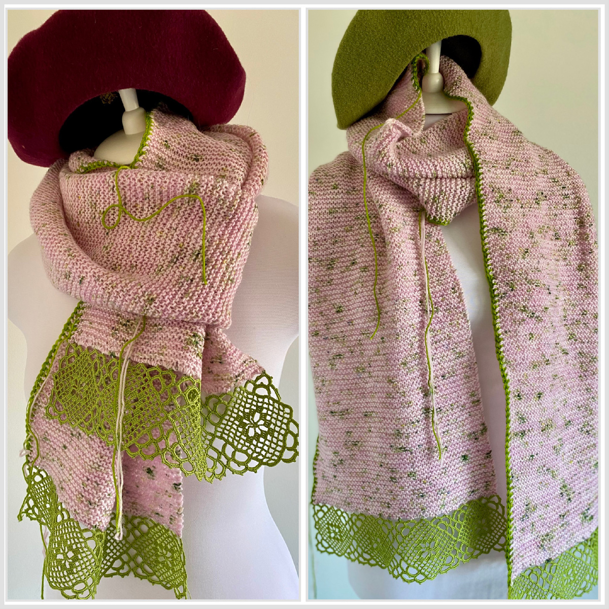 Этот шарф я не могла не связать. Пряжа ручного окрашивания Натальи Фадеенко (артикул «Нежный пион») идеально подошла к зеленому кружеву.