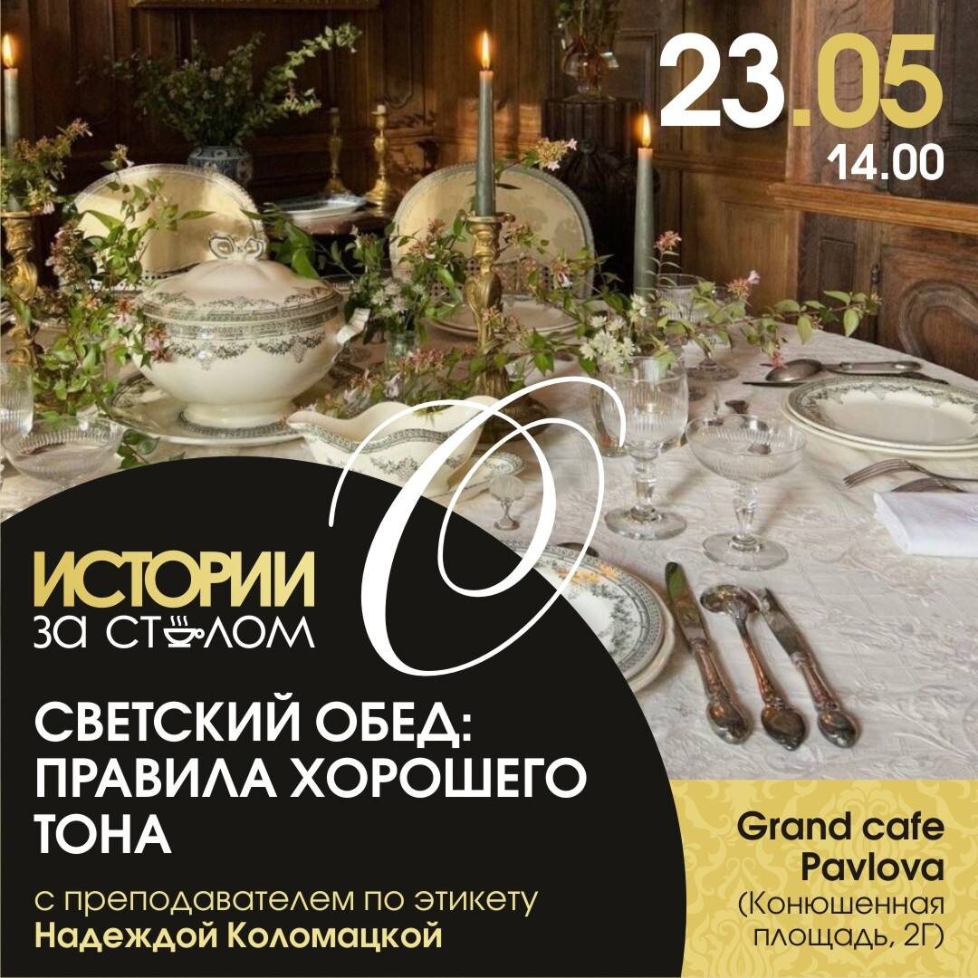 » ✨23 мая в 14:00 Grand cafe Pavlova (Конюшенная площадь 2Г)✨ Ведет встречу - преподаватель по этикету Надежда Коломацкая. Хотите чувствовать себя уверенно за любым столом? А если это будет не скучная лекция, а обед-практика, где всё можно сразу применить? 🍽️разберёмся в назначении столовых приборов; 🍽️научимся уверенно вести себя за столом и избегать неловких ситуаций; 🍽️поговорим о правилах посадки и невербальных сигналах; 🍽️освоим тонкости сервировки; 🍽️на практике отработаем подачу и употребление блюд; 🍽️узнаете нюансы, которые сразу выдают хороший вкус и воспитание Меню: 1️⃣ Салат с ростбифом, печёным перцем и соусом тонато; 2️⃣ Голубцы из краба и креветок с соусом берр блан; 3️⃣ Куриный бульон с пастрами и домашней лапшой; 4️⃣ Вода; 5️⃣ Чай/кофе Стоимость мероприятия 6990₽ за персону 🎟️ Билеты: пишите в сообщения сообщества ВКонтакте vk.ru/istorii_za_stolom или покупайте на сайте izastolom.ru ‼️И подписывайтесь на наш канал в MAX, чтобы не пропускать новые истории