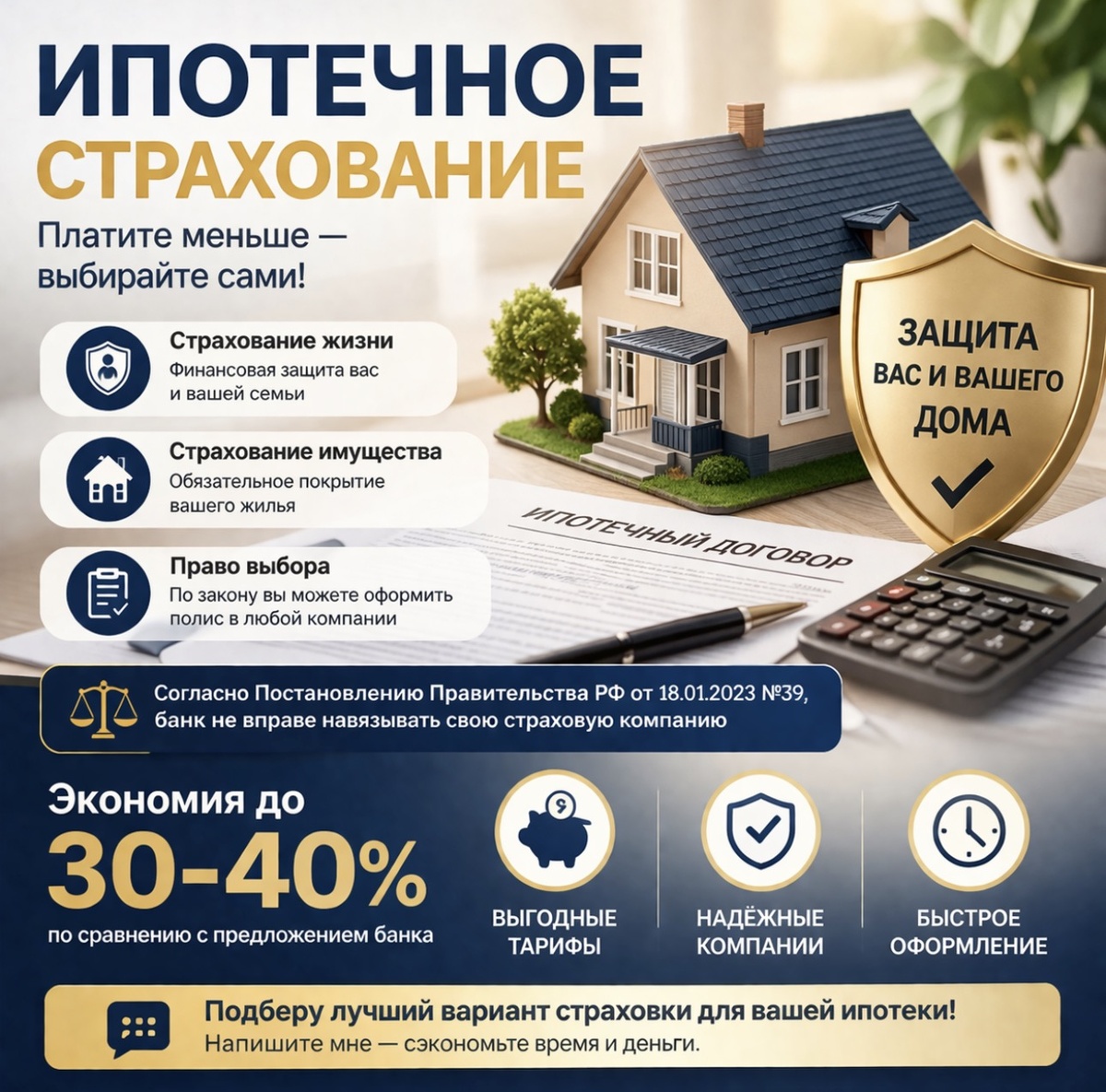 Ипотечное страхование: что нужно знать про страхование жизни и имущества При оформлении ипотеки каждый заёмщик сталкивается с обязательным страхованием. Банки, как правило, предлагают оформить полисы через «свои» страховые компании. Однако далеко не все знают, что у клиента есть право выбора — и это может существенно сэкономить бюджет. Какие виды страхования нужны при ипотеке При оформлении кредита обычно требуется два основных вида страхования: 1. Страхование жизни и здоровья Защищает заёмщика и его семью в случае непредвиденных ситуаций — болезни, инвалидности или смерти. В случае страхового события страховая компания погашает задолженность перед банком. 2. Страхование имущества (залога) Обязательное по закону страхование недвижимости от рисков повреждения или утраты (пожар, затопление, стихийные бедствия и т.д.). Без него ипотеку оформить невозможно. Почему банки предлагают «свои» страховые компании На практике банки сотрудничают с определёнными страховыми компаниями и направляют кл