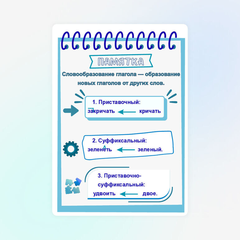 Памятка «Словообразование глагола» - это наглядный и удобный учебный материал по русскому языку, предназначенный для учащихся 5–7 классов, а также для подготовки к ВПР и ОГЭ. Шпаргалка содержит основные способы образования глаголов: приставочный, суффиксальный, приставочно-суффиксальный. Материал представлен в краткой, структурированной форме с примерами, что облегчает понимание и запоминание темы. Памятка подходит для использования на уроках, при самостоятельной работе, повторении и подготовке к контрольным работам. Яркий дизайн повышает интерес к обучению. Отличный вариант для учителей, репетиторов и родителей.