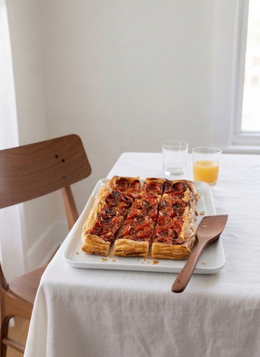 Ингредиенты: Пласт дрожжевого слоеного теста 500 г; 500 г помидоров среднего размера типа фламенко; 20 мл оливкового масла + немного для обрызгивания; Щепотка соли; Свежемолотый перец 1/2 ч л; Щепотка сахарного песка 1/2 ч л; 1-2 ст л зернистой горчицы; 1 ч л сушеного орегано; 50 тертого на очень мелкой терке твердого сыра; Разогрейте духовку до 130. Разрежьте помидоры пополам и удалите семена. Измельчите чеснок, смешайте оливковое масло с солью, свежемоллттым перцем и сахарным песком. Противень застелите пергаментом. Вылейте этот соус на пергамент, а сверху распределите половинки томатов округлой стороной вверх. Запекайте в течение часа. Дайте остыть. Разогрейте духовку до 180. Достаньте тесто из морозилки. Немного раскатайте. Сделайте условную рамку как для картины. Внутри рамки аккуратно проткните вилкой и смажьте горчицей. Разложите помидоры выпуклой стороной вниз. Сбрызните оливковым маслом и посыпьте небольшим количеством орегано, солью и свежемолотым перцем. Выпекайте около 35-