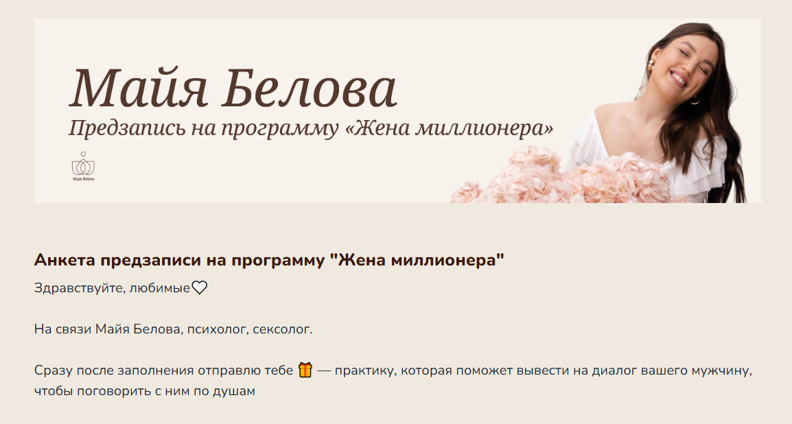 Но самое интересное и показательное начинается тогда, когда вы пытаетесь узнать цену за этот заветный билет в счастливую богатую жизнь. Вы не найдете открытого прайс-листа! Белова категорически отказывается называть стоимость своих занятий в открытом доступе. Вместо прозрачной и честной коммерции, вам предлагают пройти некую бесплатную предзапись. И вот тут-то и кроется главный подвох всего этого предприятия. Эта регистрация — не просто формальность для сбора контактов. Вам придется заполнить подробнейшую анкету, которая больше напоминает строгий финансовый допрос с пристрастием. От вас требуют указать не только базовые фамилию, имя и номер телефона, но и ваш статус в отношениях, а самое главное — ваш реальный доход и уровень готовности к приобретению обучающих уроков! Зачем так называемому "психологу" лезть в ваш кошелек еще до начала работы? Ответ лежит на поверхности: автор банально отсеивает тех, кто не способен оплатить ее непомерно дорогие фантазии. Если вы укажете скромный доход, вы просто не пройдете фейс-контроль. Это чистой воды коммерческий фильтр, который неопровержимо доказывает, что главная цель проекта — не реальная помощь одиноким девушкам, а банальное выкачивание средств из тех, кто может себе это позволить.