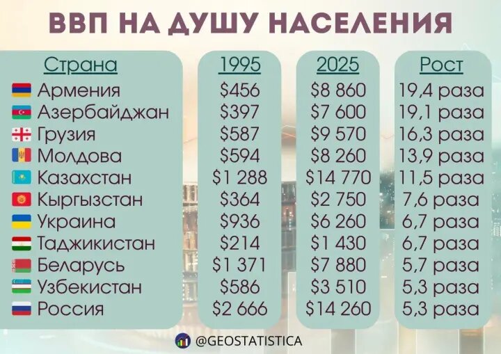 Согласно приведённым данным, наибольший рост ВВП на душу населения с 1995 по 2025 год среди стран бывшего СССР зафиксирован в республиках Закавказья. Лидером по темпам роста стала Армения, где показатель увеличился с 456 долларов в 1995 году до 8 860 долларов в 2025 году, то есть в 19,4 раза. Следом идёт Азербайджан: с 397 долларов до 7 600 долларов, что соответствует росту в 19,1 раза. Третье место занимает Грузия, где показатель вырос с 587 долларов до 9 570 долларов, или в 16,3 раза.