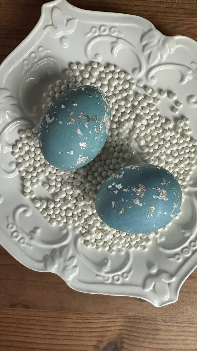 🥚🌿 Ингредиенты: 100–150 г цветков Анчана, 1 ч. л. соли, 2 ст. л. уксуса, холодная вода, пищевое серебро. Приготовление: 1. В сотейник положить цветки, сырые яйца, соль, уксус и воду. 2. Варить 10 минут, выключить огонь и настаивать ещё 10 минут. 3. Достать яйца и высушить. Цвет станет небесно-голубым 💙. 4. На руку нанести сырой белок и пищевое серебро, обвалять остывшие яйца в серебряных хлопьях. 5. Переложить на тарелку до полного высыхания ✨. #пасха #пасхальныйдекор #яйца