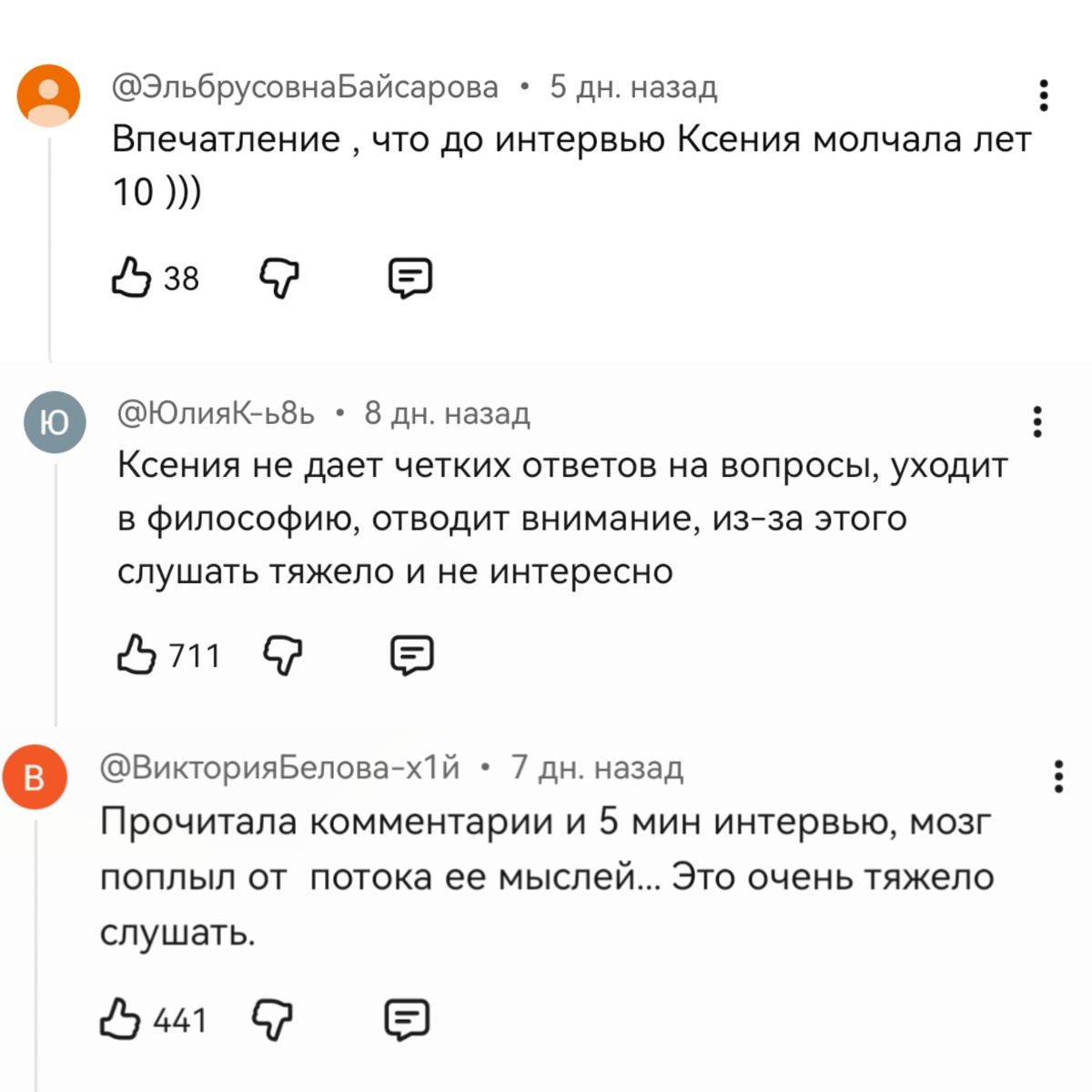 Ксения говорила очень много, долго, быстро, иногда бессвязно, и часто одно и то же, но разными словами. Это заметила не только я, но и другие зрители, которые не стеснялись сообщить об этом в комментариях к интервью. Многие даже ставили диагнозы болтливости героини (листайте карусель):