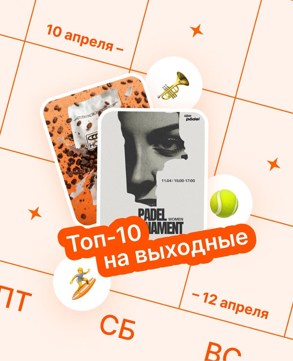 ⭐️ Мини-сет событий из каталога «Вечерами»: АЛКОШАХМАТЫ ПТ, 10.04, 19:00 ул. Мира, 40, бесплатно, 18+ КОСМИЧЕСКАЯ ВЕЧЕРИНКА В МЕТРО ПТ, 10.04, 21:00 МЕТРО, ул. Красная, 72/1, от 800₽, нужен билет, 18+ PADEL TOURNAMENT: ЖЕНСКИЙ ТУРНИР СБ, 11.04, 15:00 ул. Невкипелого, 24/4, нужна запись, 18+ МАСТЕР-КЛАСС ПО КОЛЛАЖИРОВАНИЮ СБ, 11.04, 17:00 ул. Зиповская, 9литК, донат, нужна запись, 16+ ДИДЖЕЙ-СЕТ НА СПОТЕ SURF COFFEE X AURORA СБ, 11.04, 18:00 Surf Coffee, ул. Красная, 206, вход свободный, 16+ ПЛАСТИЧЕСКИЙ СПЕКТАКЛЬ «КОНТАКТ» СБ, 11.04, 18:00 ул. им. Стасова, 175, нужен билет, 12+ НОЧЬ БАТУТОВ СБ, 11.04, 22:00 ТРК "Меридиан", ул. Стасова, 182/1, от 1500₽, нужен билет, 18+ ВЕСЕННЯЯ ГАРАЖНАЯ РАСПРОДАЖА В ЭКОЦЕНТРЕ ВС, 12.04, 12:00 Экоцентр Чистая среда, ул. Одесская, 48В, вход свободный, 0+ ЗНАКОМСТВО С ЛОТАМИ КОФЕ HQ!COFFEE ВС, 12.04, 14:00 ул. Школьная, 1, бесплатно, нужна запись, 16+ КОНЦЕРТ АНТОХА МС ВС, 12.04, Творческая площадка «Порт 219», нужен билет, 18+ Ещё несколько со