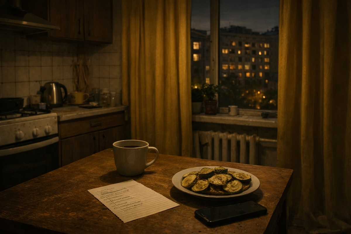 Дома она первым делом открыла окно на кухне. Воздух с улицы пах железом и мокрым асфальтом. На подоконнике лежала пустая банка из-под кофе с пакетами сахара. Ольга бросила туда ключи, включила чайник и поставила сковороду на плиту. Есть не хотелось, но нужно было хоть что-то сделать руками. Она нарезала кабачок кружками, посолила, потом долго искала муку, хотя мука стояла на месте, в белой банке с синей крышкой.