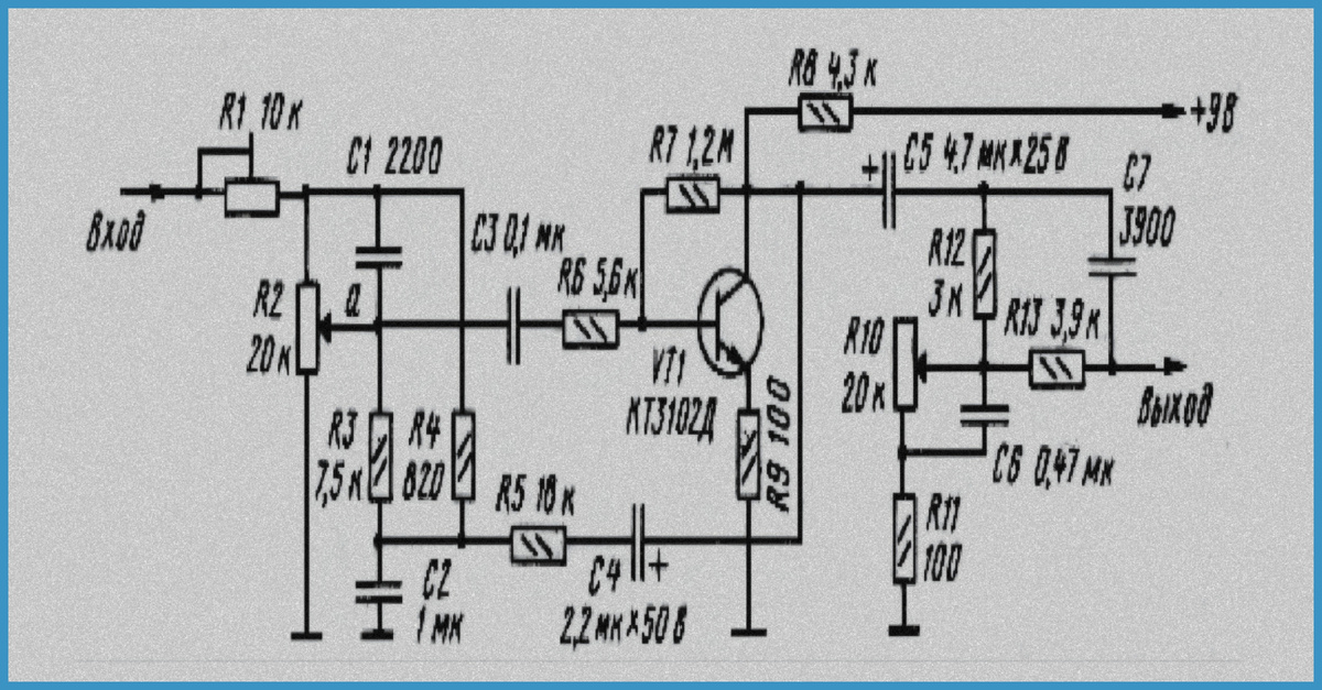 - Выходной каскад (R8-R13, C5-C7) - стабилизирует и фильтрует выходной сигнал перед подачей на УМЗЧ.