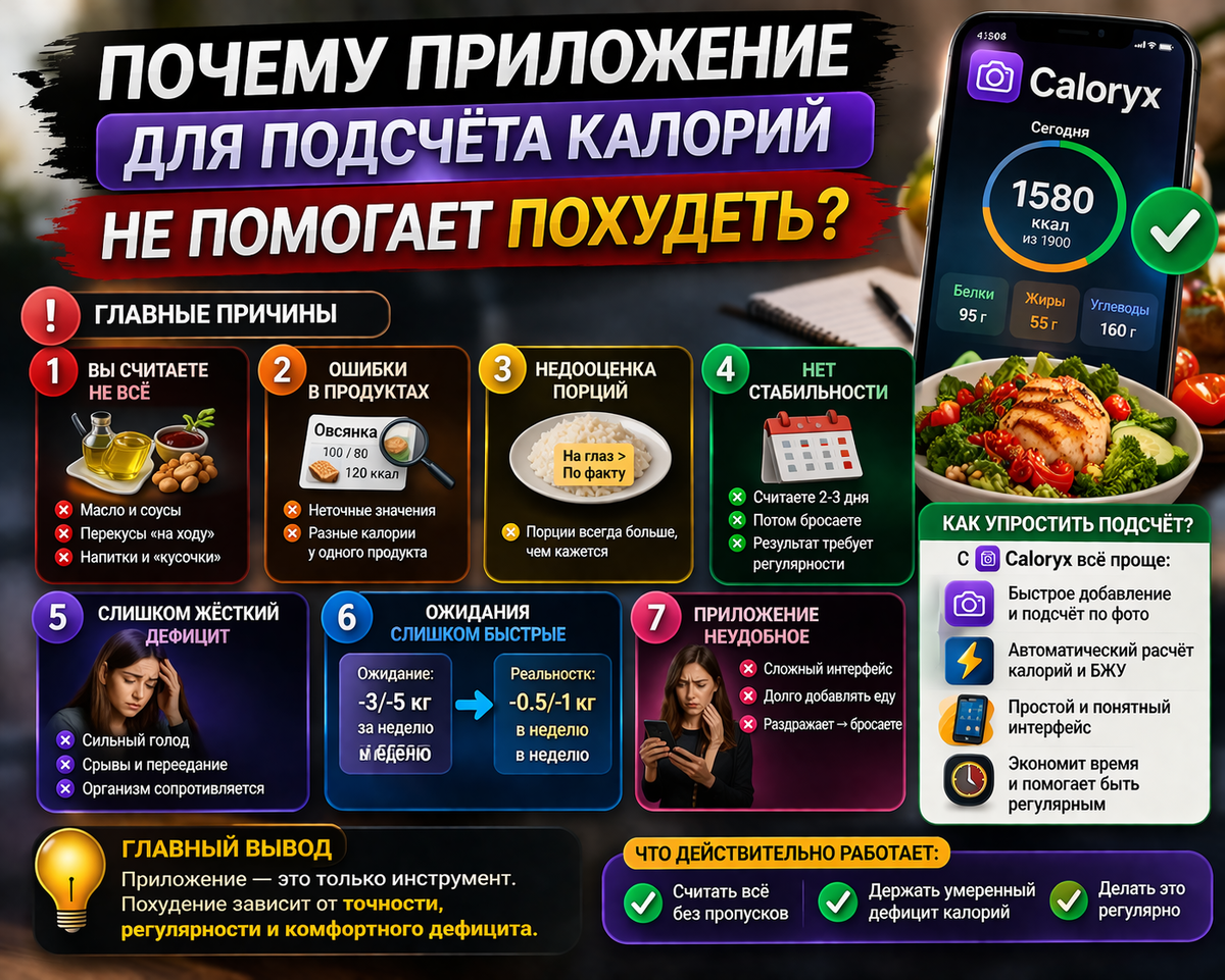 👉 0.5–1 кг в неделю Если приложение: 👉 вы просто перестаёте им пользоваться. Важно, чтобы приложение было: Например, в Caloryx можно: 👉 Это снижает шанс «бросить» подсчёт. Приложение не худеет за вас. Оно только помогает. Результат будет, если: 👉 Тогда работает любое приложение.